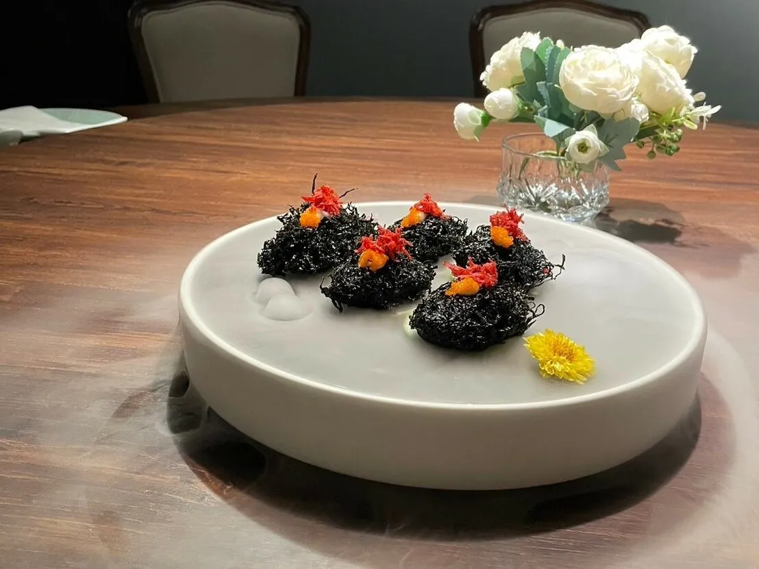 一進包廂,我們立刻被溫暖的燈光和舒適的座位吸引。首先,我們點了「酒沏苔味九孔鮑」。這道菜將新鮮的九孔鮑滷煮後裹上海苔酥炸,鮮嫩彈牙,搭配甜薑和蝦卵,味道非常獨特。大家對這道菜讚不絕口,並紛紛拍照留念。