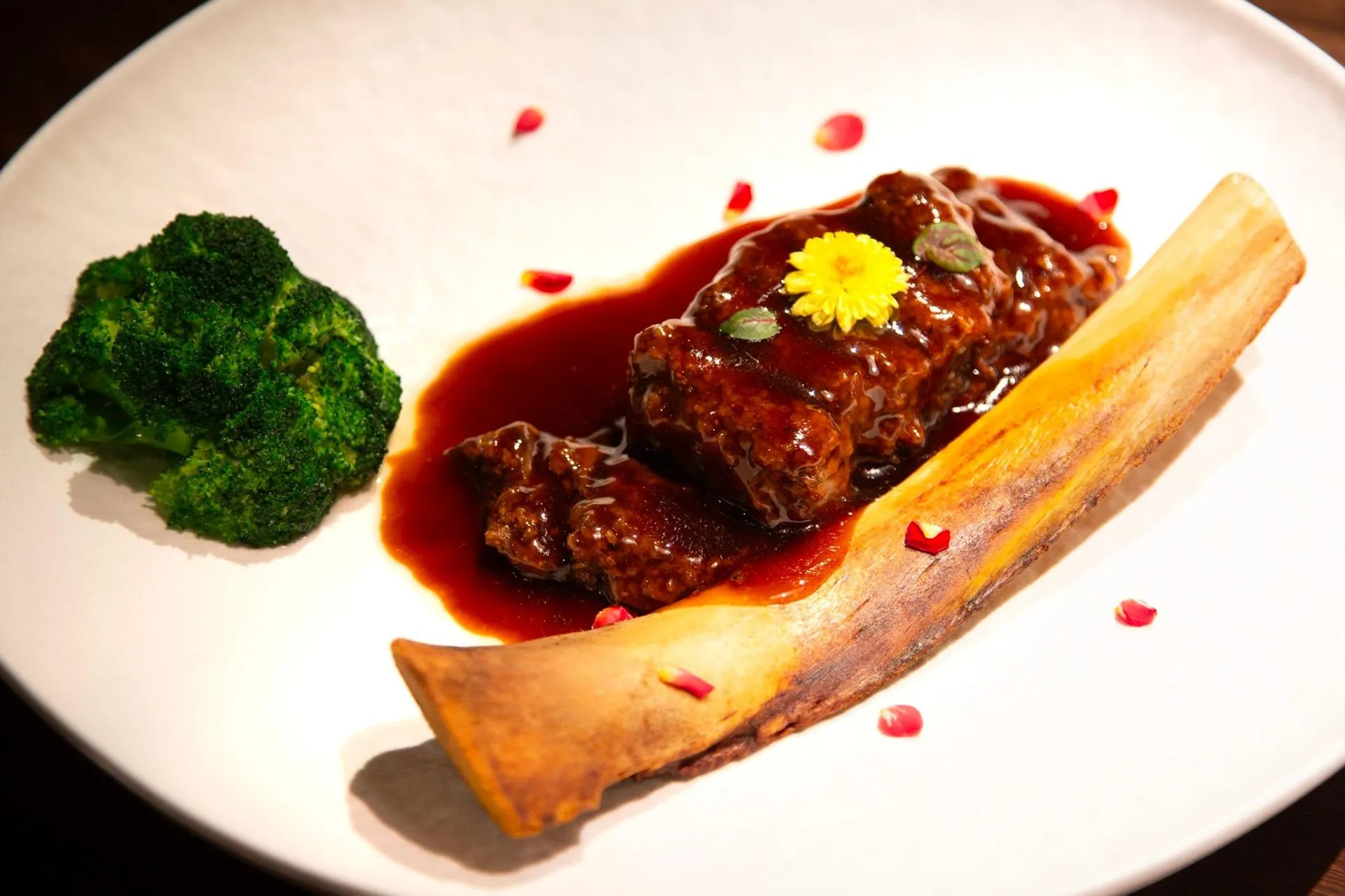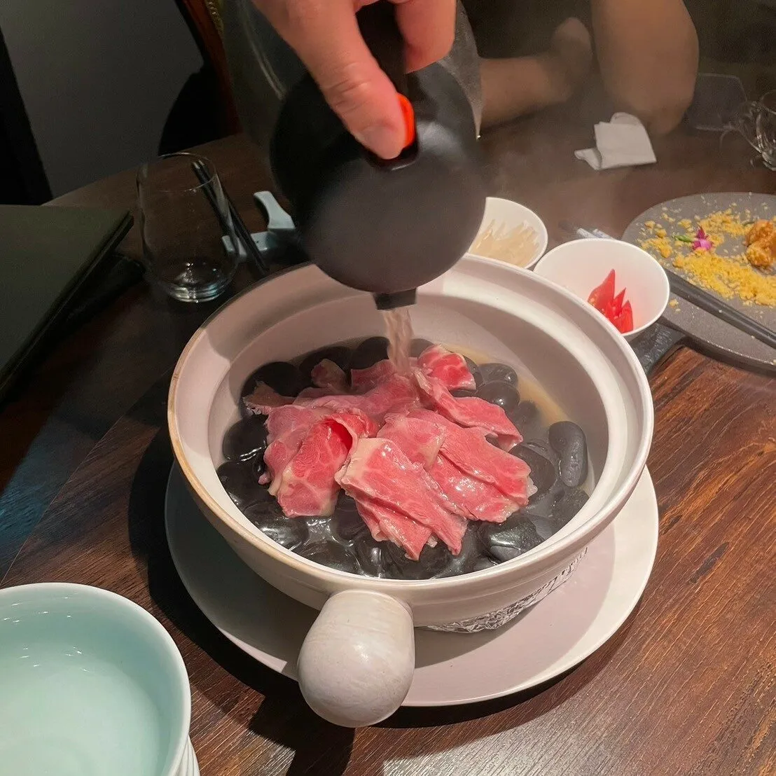 接著,我們點了「新台灣牛肉湯」。這道湯品選用了無骨牛小排,上桌時服務人員將牛肉片鋪於燒燙的石頭上,再以牛骨高湯沖淋,高溫激出濃郁的肉湯香氣。肉片瞬間半熟,湯汁鮮美,再加上檸檬汁和九層塔,讓我們感受到不同風情的牛肉湯。這道菜的口感和風味都讓我們感到非常驚艷。