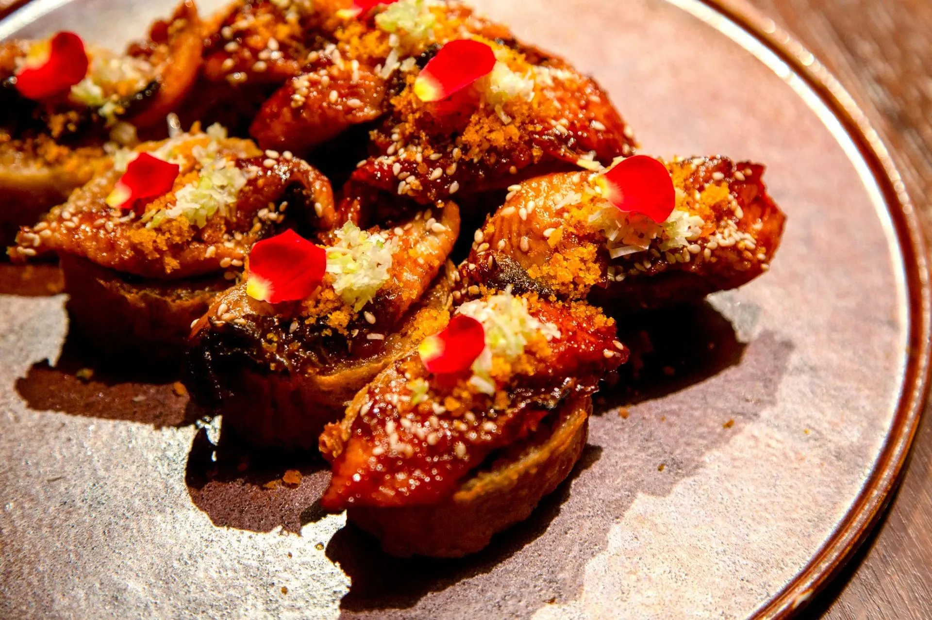 一進包廂,我們就感受到這裡浪漫的氛圍。首先,我們點了「烤鰻烏魚子米糕捲」。這道菜的外觀非常精緻,越南網皮包裹著油飯,外層煎炸至金黃,再鋪上烤鰻魚片和烏魚子粉,香氣四溢。我們對這道菜的美味感到非常驚喜。
