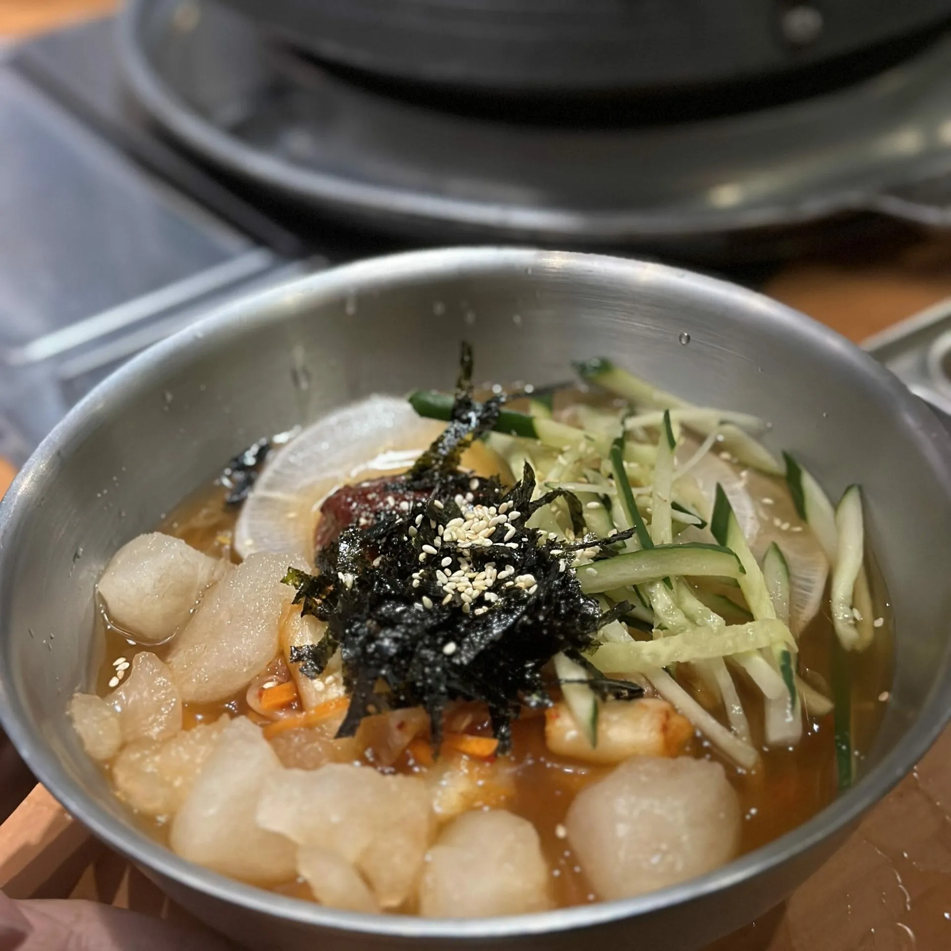 在享受完這些美食後,服務生又推薦了他們的韓國水冷麵,說這是韓國吃完烤肉後的習慣。我抱著試試看的心態點了一份。水冷麵的湯底非常清爽,搭配著冰涼的麵條,吃下去有一種前所未有的清涼感,真的很解膩。