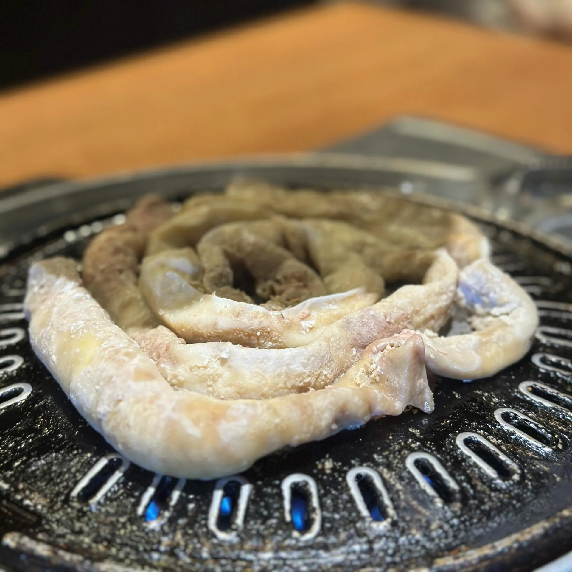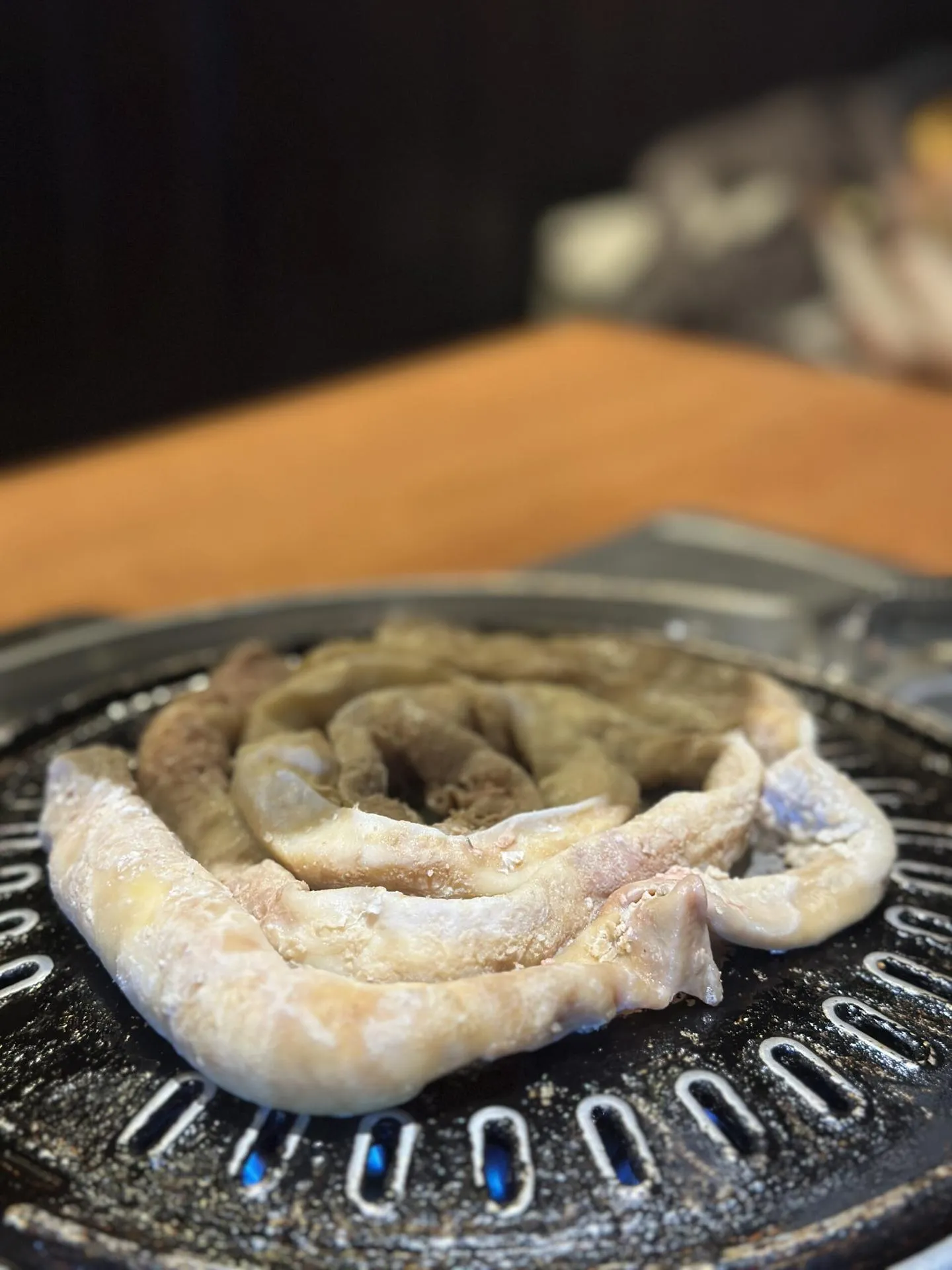 不一會兒,服務生便端上了韓式烤腸,並親自幫我們現烤。烤腸在烤盤上滋滋作響,散發出迷人的香氣。服務生熟練地將烤好的腸子夾到我的盤子裡,並教我如何用生菜、芝麻葉和韓式醬料一起包著吃。我一口咬下去,烤腸的香脆加上生菜的清爽,再配上獨特的韓式醬料,味道簡直好極了!