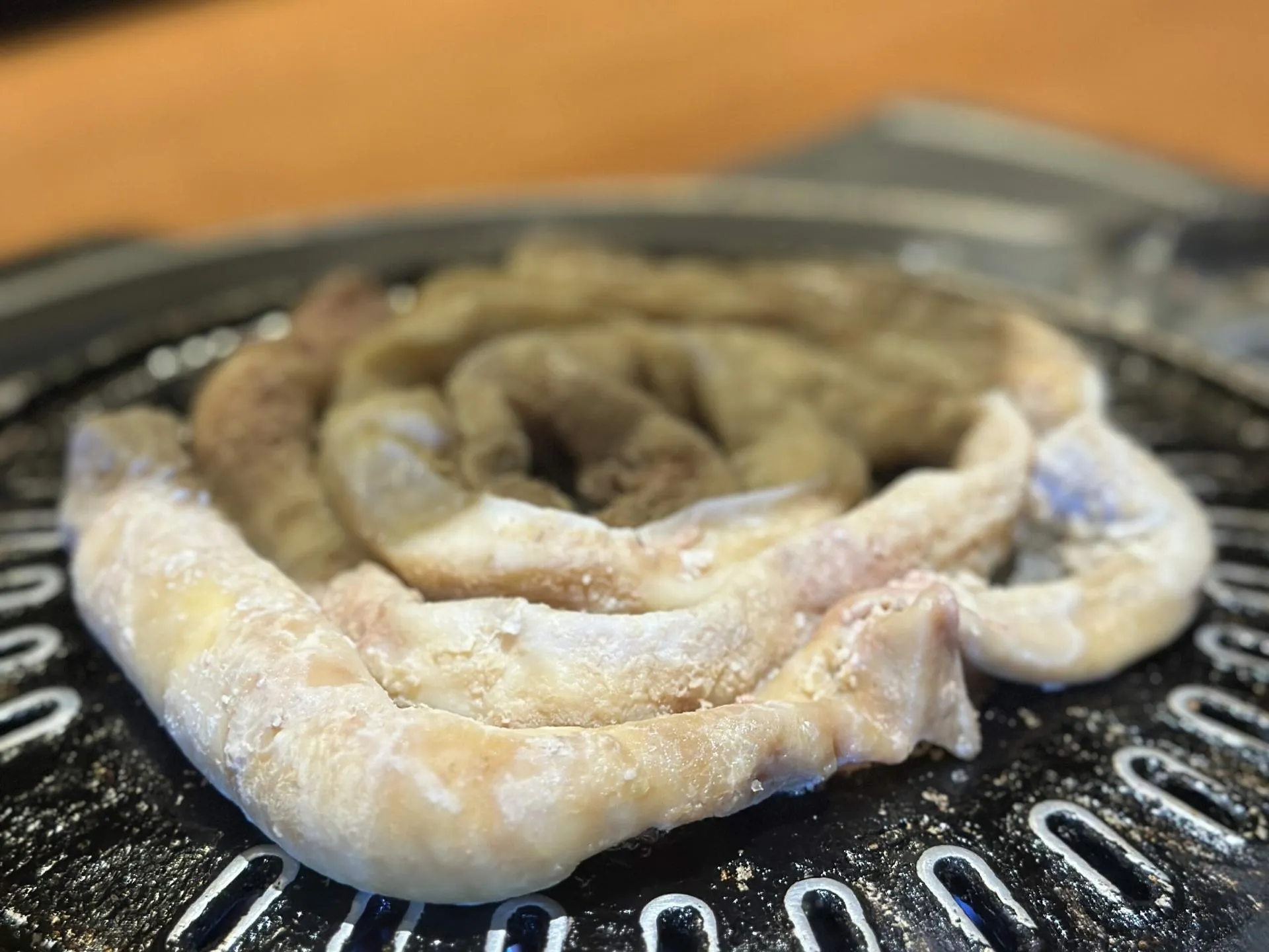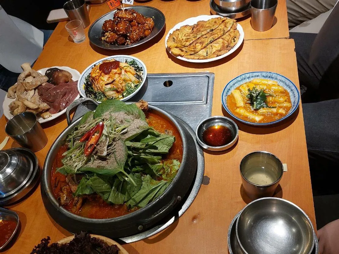 我們點了好幾道菜,包括韓式烤腸、馬鈴薯排骨湯和泡菜拌飯。每一道菜都讓人食指大動。首先上桌的是韓式烤腸。烤腸是服務生在桌邊現烤的,香氣四溢,讓人忍不住口水直流。服務生教我們如何用生菜、芝麻葉和韓式醬料一起包著吃。這種吃法真的很特別,每一口都有不同的層次感,既有烤腸的香脆,又有生菜的清爽,再加上醬料的濃郁,味道真的很絕妙。
