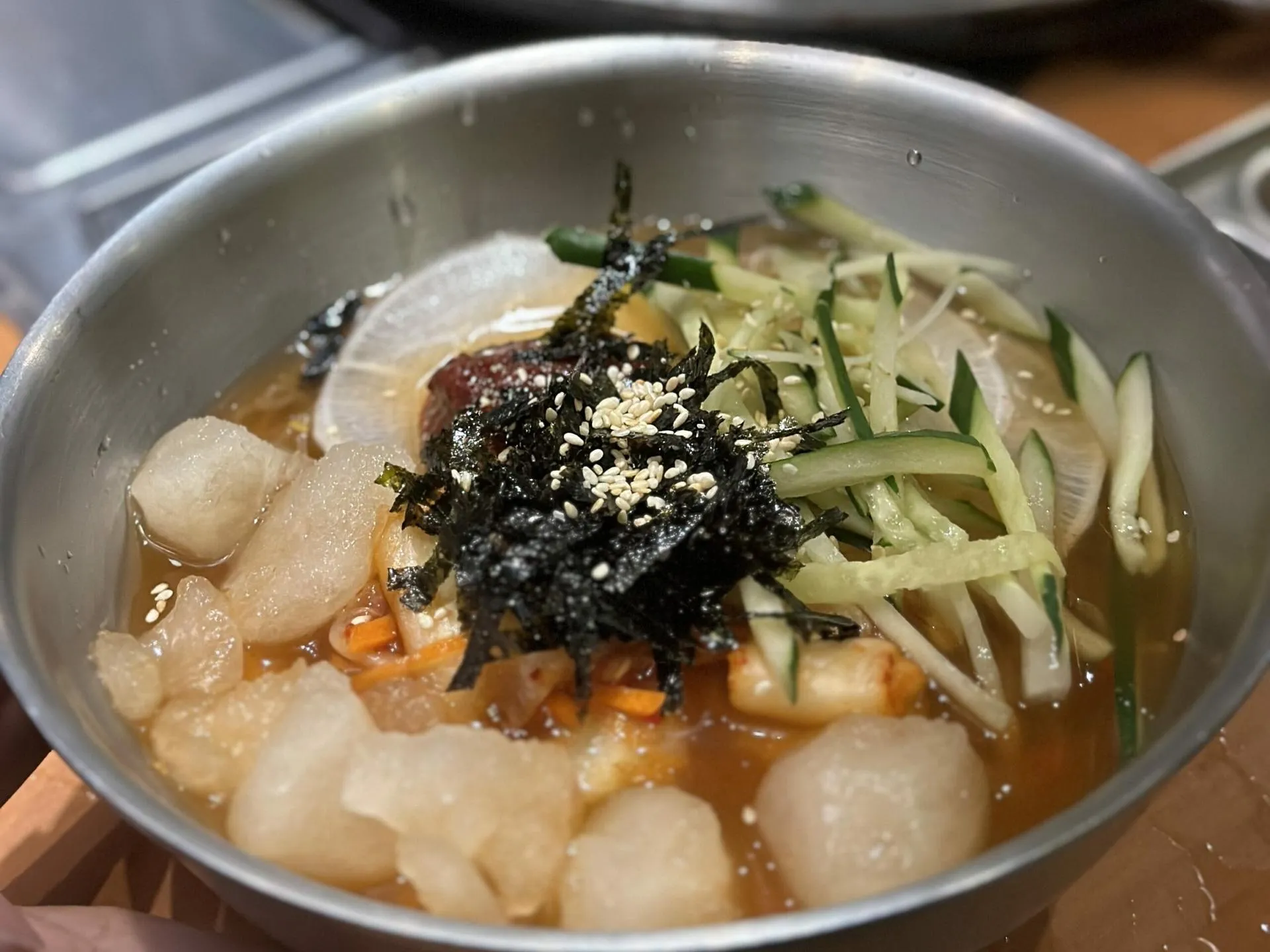 吃完主菜後,我們還點了一份水冷麵。這是韓國人吃完烤肉後常常會點的解膩菜。水冷麵的湯底非常清爽,再加上冰涼的麵條,吃起來非常過癮。