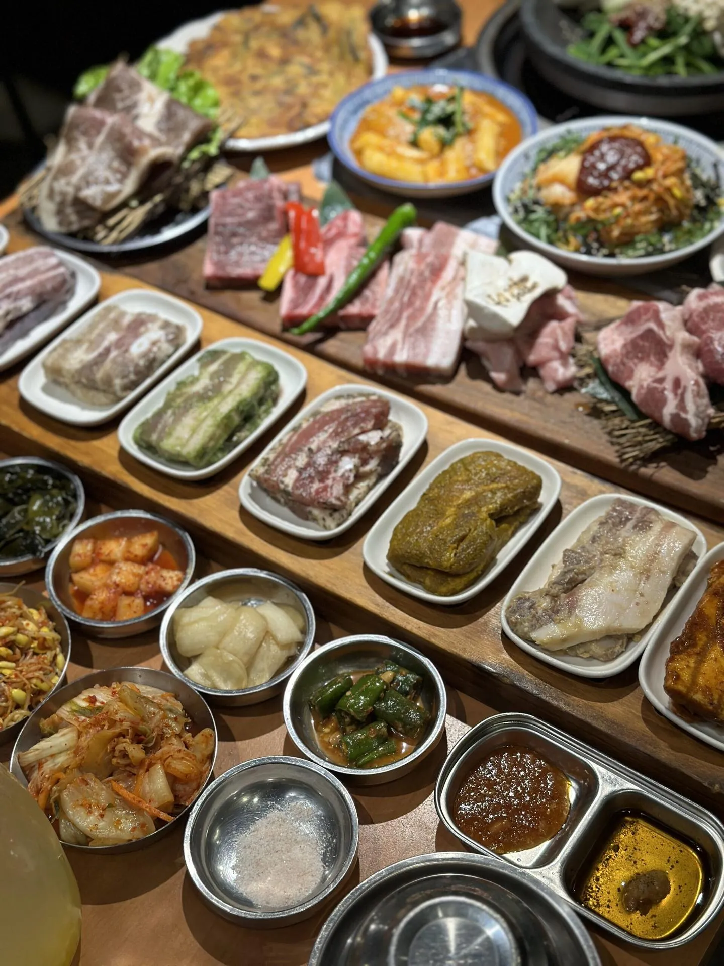 我們點了八色烤肉套餐和韓式辣炒年糕。當烤肉端上來時,服務生非常專業地幫我們燒烤。不同口味的肉片在燒烤盤上滋滋作響,香氣四溢,搭配各式各樣的小菜,每一口都充滿了驚喜。