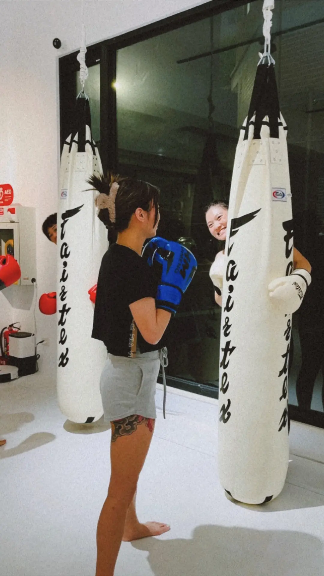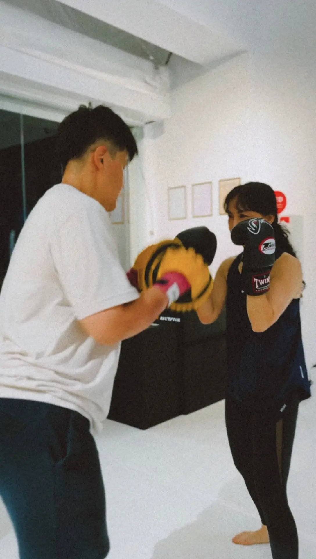 然後就開始進入到課程了!一開始覺得要打拳很緊張,想說會不會被打(自己腦補?)不過課程從最簡單的出拳開始。教練會一步步地帶我學習動作,從如何站姿到如何出拳、踢腿,他都會非常仔細地指導。雖然動作看似簡單,但當我實際做起來時,發現要做到每一個動作都精準還是很有挑戰的。在學習的過程中還會玩一些運動的小遊戲,覺得和朋友一起來真的一整堂課都在笑。