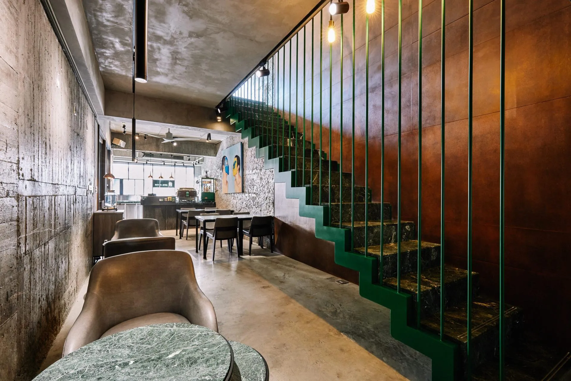 一踏入八巷的店門,映入眼簾的是一面原始水泥牆,帶著粗獷的工業風格,牆上還保留著施工時的標記,給人一種未經過多雕琢的美感。作為設計師,我對這樣的設計特別有感覺,因為它呈現了建築中「減法設計」的哲學——去掉不必要的裝飾,只保留最純粹的形態。店內的桌面由來自花東的台灣特有蛇紋石製成,每一塊石材都有其獨特的紋理和顏色,這讓我不禁停下腳步,仔細觀察這些天然的藝術品。