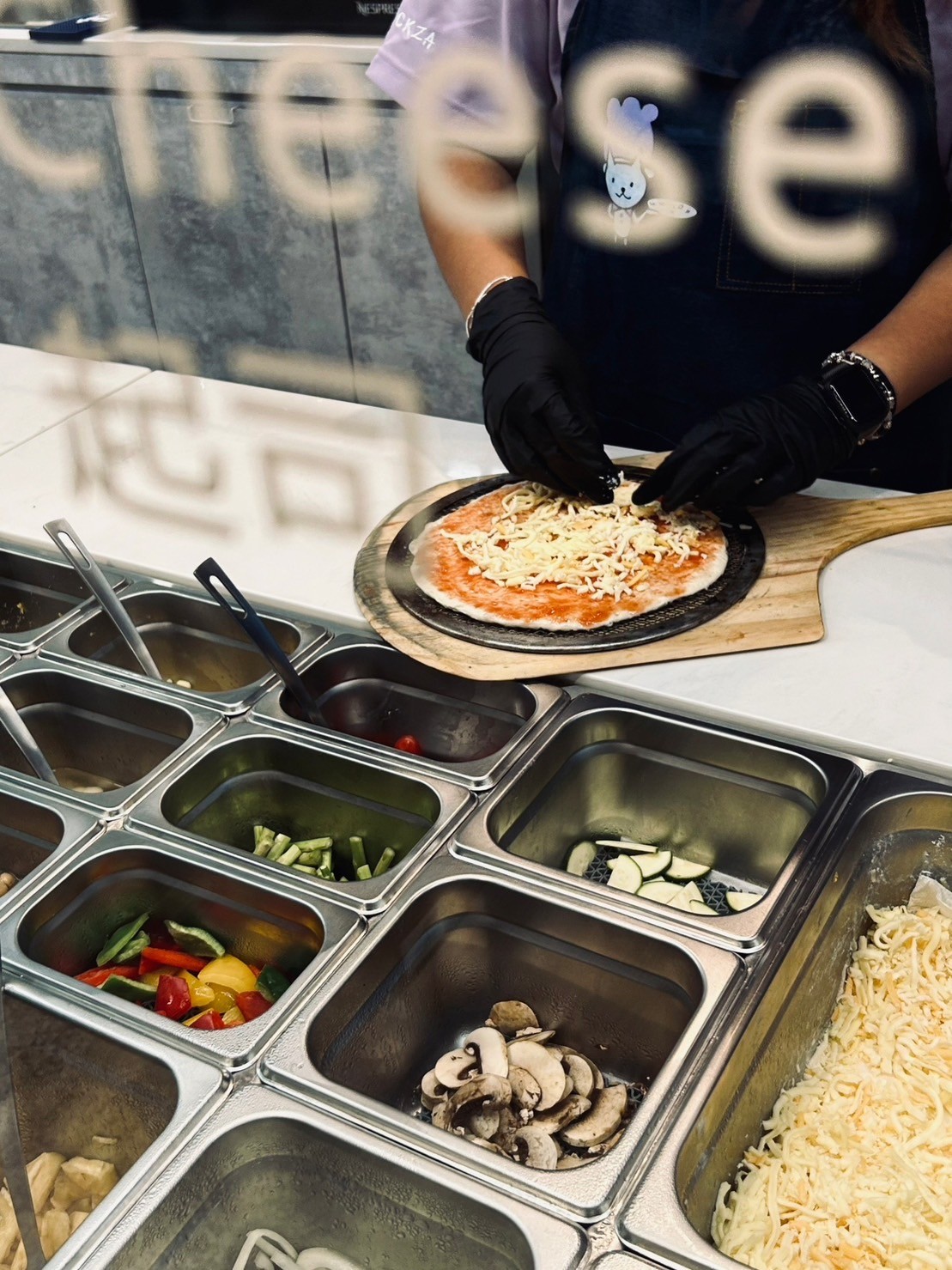 接著輪到配料登場,真是個大挑戰!菜類有甜椒、櫛瓜、玉米、鳳梨、黑橄欖等選擇,肉類還有火腿、蝦仁、培根、辣味臘腸等,還可以全素搭配。這個時候,選擇困難症開始發作了。我最後決定來個「經典安全牌」:洋蔥、洋菇、玉米,加上義式雞肉和培根,怎麼吃都不會出錯。朋友則挑戰了「重口味創意版」,選了蒜味香腸、墨西哥辣椒和黑胡椒牛肉,看起來就很夠勁。
