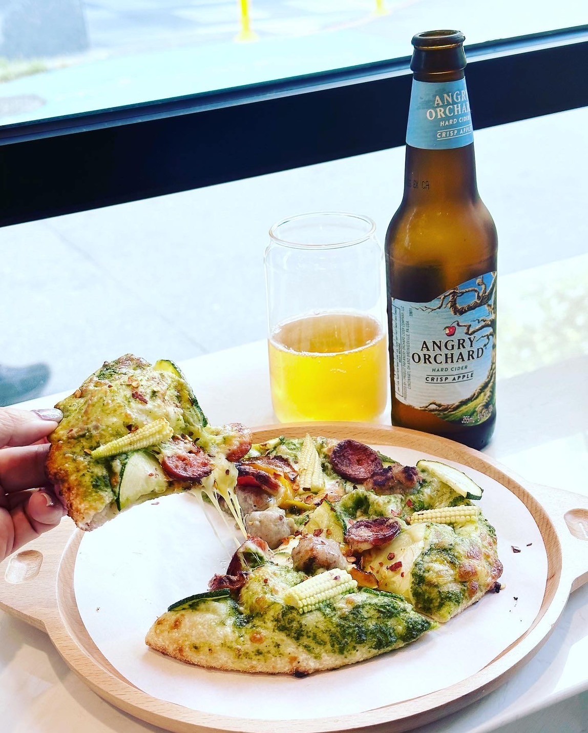 朋友的九層塔青醬披薩也很驚豔,清新的九層塔香味搭配辣味臘腸的微辣,碰撞出一種意想不到的火花。他吃得超滿足,還不忘對我說:「下次我要多加點辣味料,超搭!」