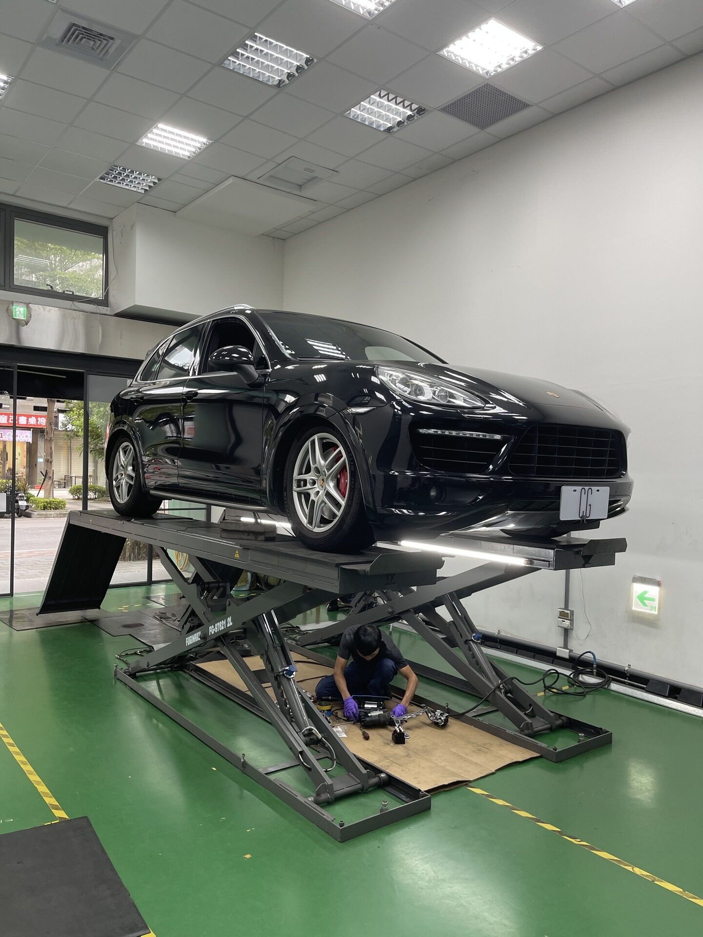 店面位於一棟 九層樓、全玻璃帷幕 的商業大樓一樓,一走進去就是六米挑高的空間,乾淨到讓人懷疑自己是不是走錯地方,完全沒有傳統修車廠那種油味與昏暗。透過四面六米高的玻璃採光牆,整個空間明亮得像精品展示間,中央空調讓氣溫舒適,而不鏽鋼工具櫃、頂規雙層重型起重設備又讓專業度提升到另一個層次。