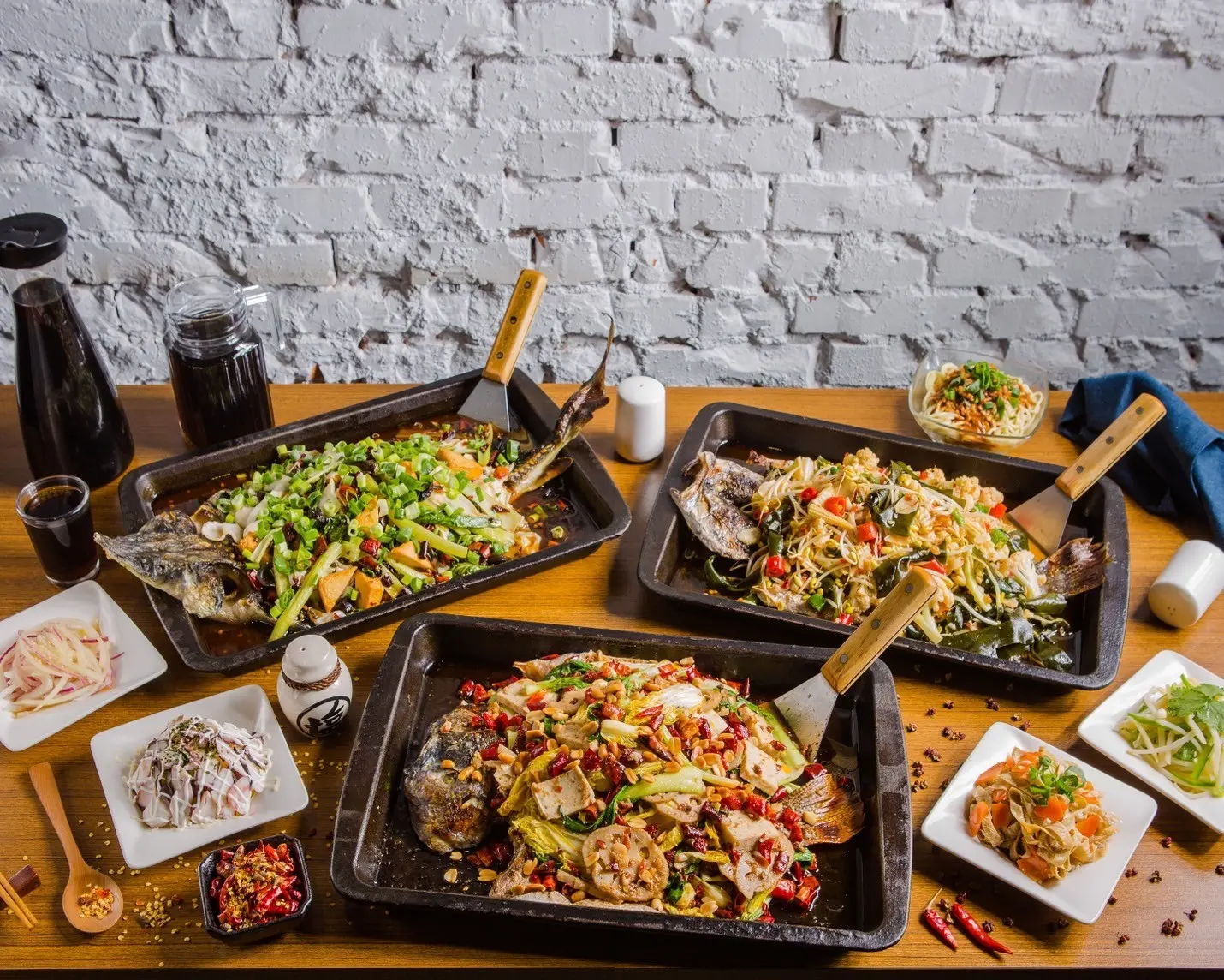 不久後,服務生端上了我們的主角——乾鍋烤魚!當麻辣香氣撲鼻而來時,大家的視線都不約而同地落在了這鍋魚上。我們選的是麻辣口味,這道麻辣烤魚使用了四川特產的麻椒,讓人感受到真正的川味精髓。魚肉表層金黃,浸滿了辛香料的香氣,夾起一塊入口,魚肉鮮嫩細膩,麻辣的濃郁風味逐漸在口腔中擴散,讓人回味無窮。
