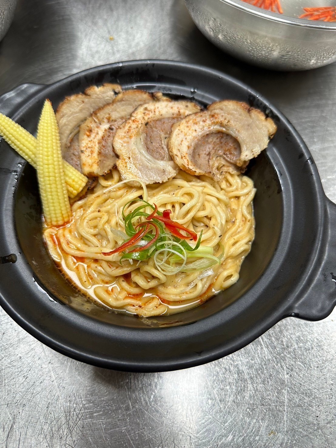 坐下後,我毫不猶豫地點了麻奶炙燒豚麵,聽著店員介紹這道麵是如何將奶香、麻辣、炙燒的豚肉完美融合,我的期待更是達到巔峰。端上桌後,這碗麵看起來真是視覺上的享受。奶油醬汁濃郁地覆蓋在麵條上,淡淡的奶香和微辣的氣息相互交融,隨著熱氣一陣陣撲鼻而來。麵上鋪著厚實的炙燒豚肉片,外層微焦,色澤誘人,旁邊點綴著幾片小蔥花,整體看起來相當豐盛。我迫不及待地夾起一口麵,準備好好品味這一口新奇的「麻奶」組合。