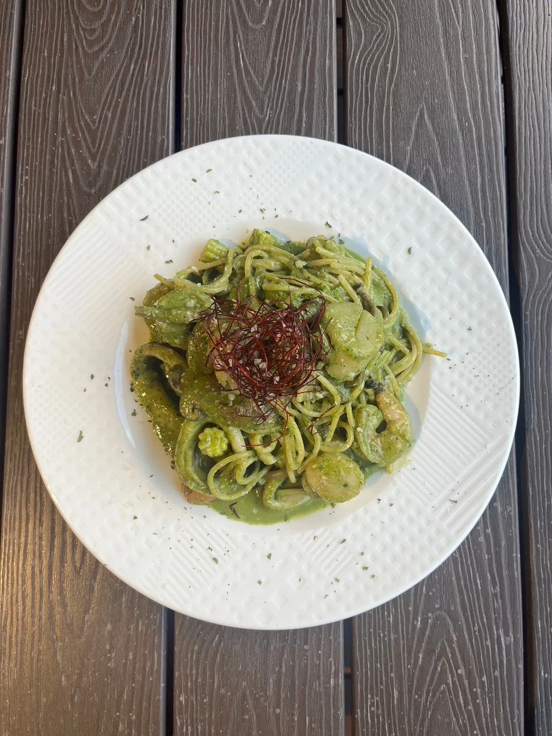 接下來,我們分享了青醬海鮮義大利麵,這道義大利麵不僅色香味俱全,還充滿了濃郁的海鮮鮮味,這些海鮮在青醬的襯托下更顯鮮甜,讓人一口接一口,停不下來。這道非常適合姐妹們一起分享,既能享受海鮮的鮮味,也不會讓人感覺過於飽足,是一份非常輕盈且美味的選擇。麵條煮得恰到好處,吸飽了青醬的香氣,每一口都讓人回味無窮。