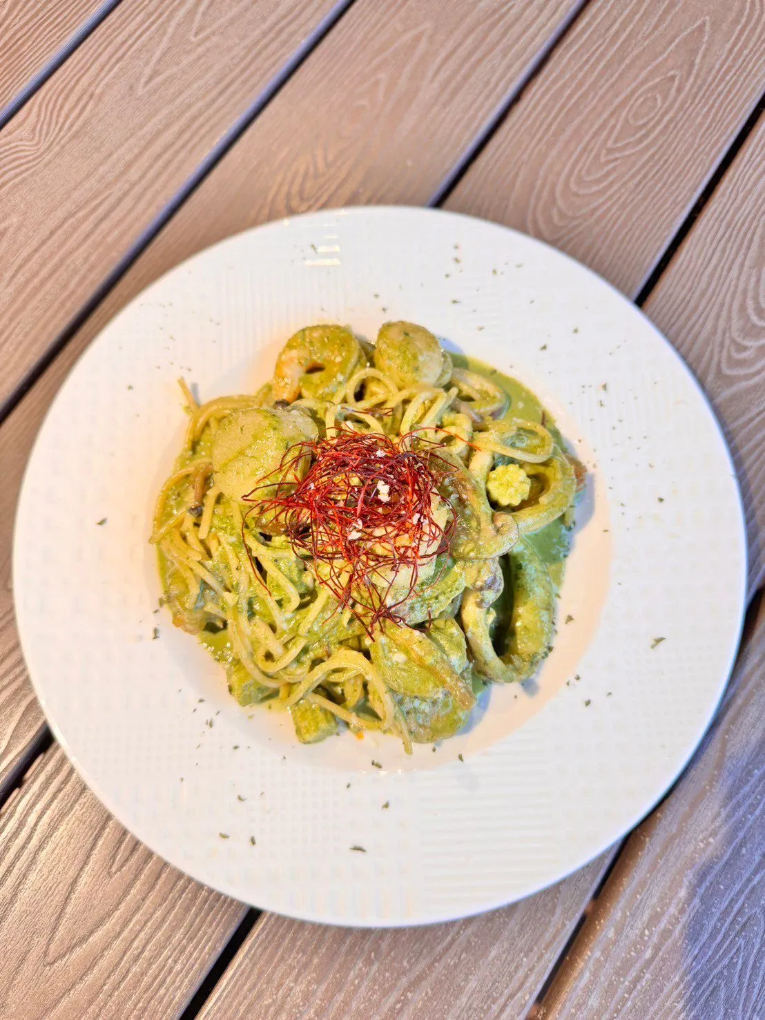接下來,我們分享了青醬海鮮義大利麵,這道義大利麵不僅色香味俱全,還充滿了濃郁的海鮮鮮味,這些海鮮在青醬的襯托下更顯鮮甜,讓人一口接一口,停不下來。這道非常適合姐妹們一起分享,既能享受海鮮的鮮味,也不會讓人感覺過於飽足,是一份非常輕盈且美味的選擇。麵條煮得恰到好處,吸飽了青醬的香氣,每一口都讓人回味無窮。