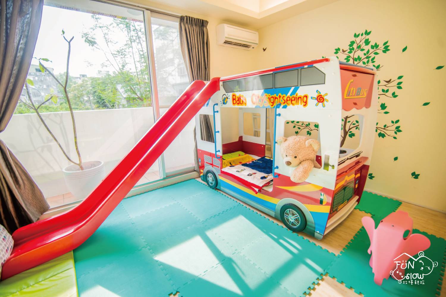 另外公共設施也很加分,四樓遊戲室可以自由進出,小朋友有溜滑梯、扮家家酒玩具,爸媽可以坐在旁邊喝咖啡聊天,簡直是親子版的小社區。民宿備品也很用心,從奶瓶消毒鍋、兒童牙刷牙杯、澡盆、洗髮沐浴乳等一應俱全,連床頭燈都有小熊造型,細節真的超暖。