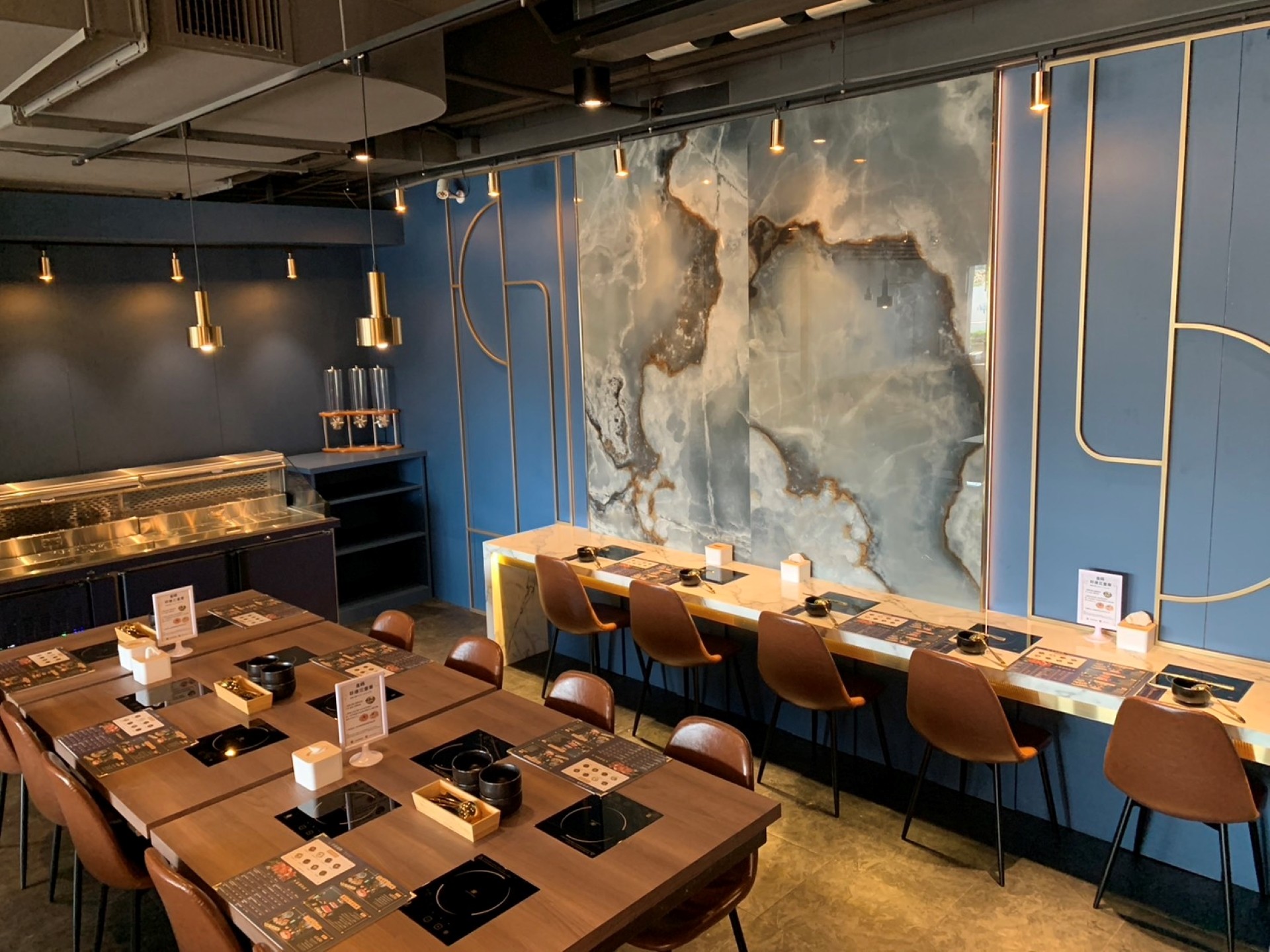 不是我要誇,但這家「金蒔鍋物」真的讓我對桃園火鍋餐廳的印象大大改觀。原本以為只是一般的聚餐選擇,沒想到一踏進桃園站前店,就完全被那股歐式風情所吸引。金色吊燈、藍色牆面搭配柔和燈光,整體氛圍根本不是常見的火鍋店格局,反而更像是走進西餐廳,優雅卻不拘謹,讓人馬上卸下白天的疲憊,準備好享受一場豐盛的饗宴。