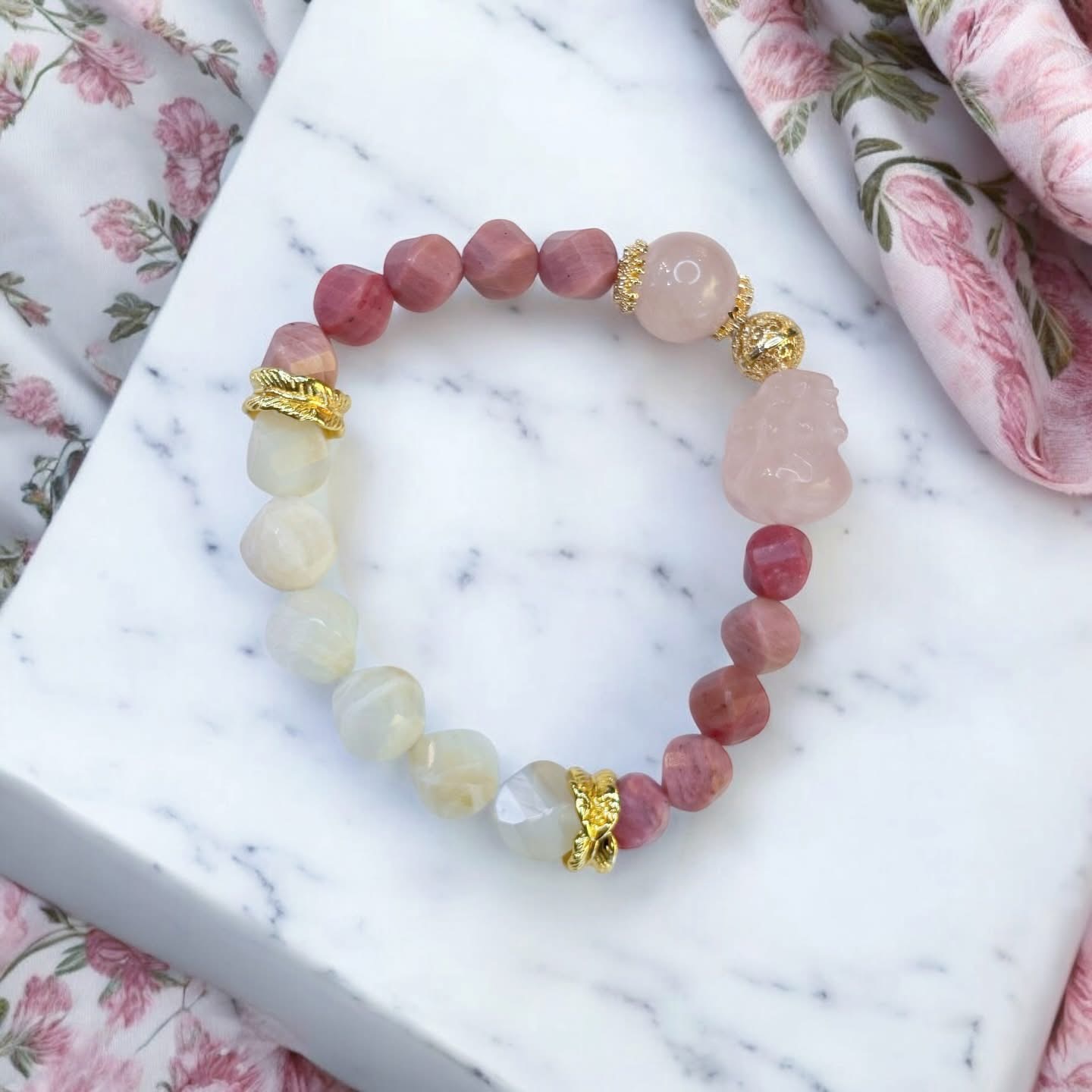 首先,這條手鍊真的美,不是那種傳統「硬要擺神秘氣場」的路線,而是帶點清新、可愛又優雅的風格。我拿到的款式是用草莓晶、白水晶和淡粉月光石組成,搭配金色隔珠與一個小小的蝴蝶墜飾,整體配色超級柔和,簡直就是為了搭配白襯衫或春日長裙而生。