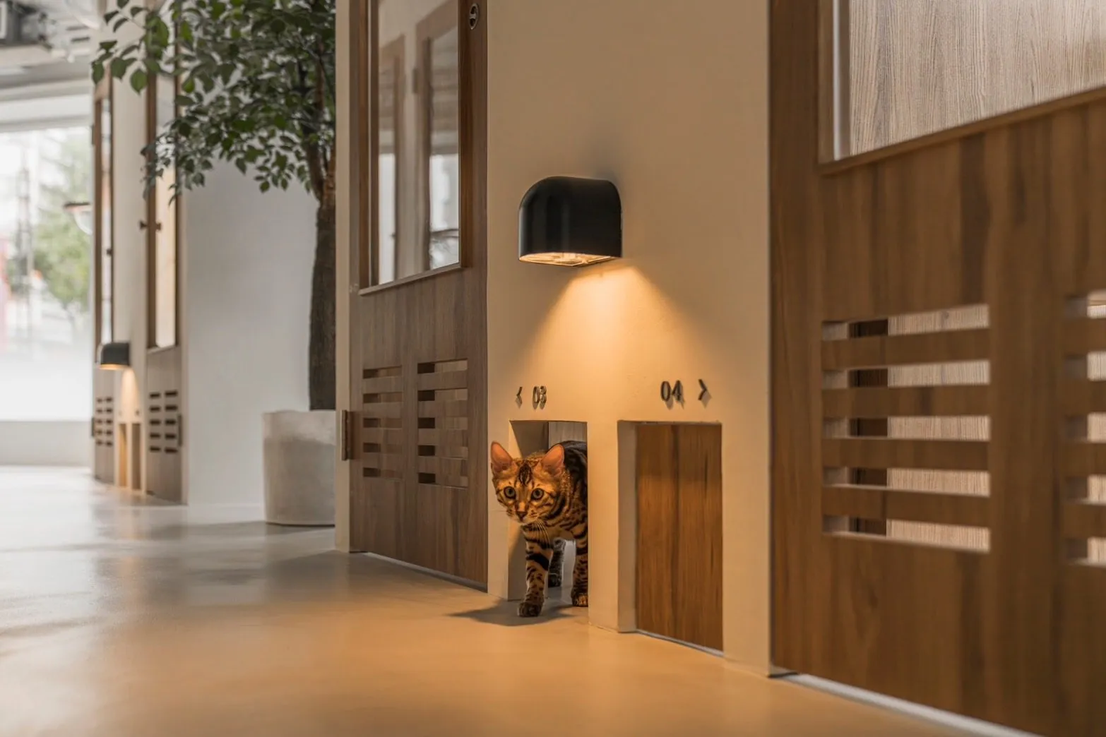 這家貓咪旅館設計精美,一切都從貓咪的視角出發。每間都是明亮寬敞挑高的樓中樓房型、豪華的貓爬架、柔軟的床鋪,讓貓咪享受無與倫比的舒適感。全室採大面落地採光且每間擁有對外太空艙,讓貓咪可以曬到陽光,享受悠閒的獨處時光。甚至每天都會讓貓咪輪流放風,特別注重了貓咪的自由與安全,更有專門為了敏感貓咪的房型,讓主人不再擔心。