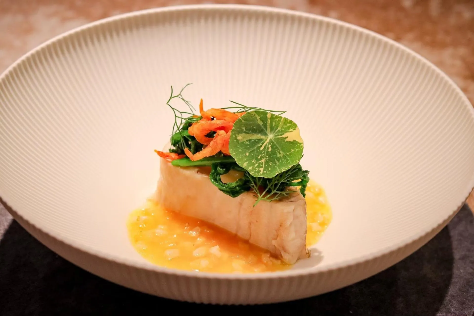 隨後,冬季鰤魚也如約而至。這道菜選用了最新鮮的日本鰤魚,搭配紫蘇柑橘發酵金棗與美濃新鮮白玉蘿蔔。鮮魚的甘甜與紫蘇的香氣交織在一起,仿佛冬季的清新氣息在舌尖上綻放,令人心旷神怡。