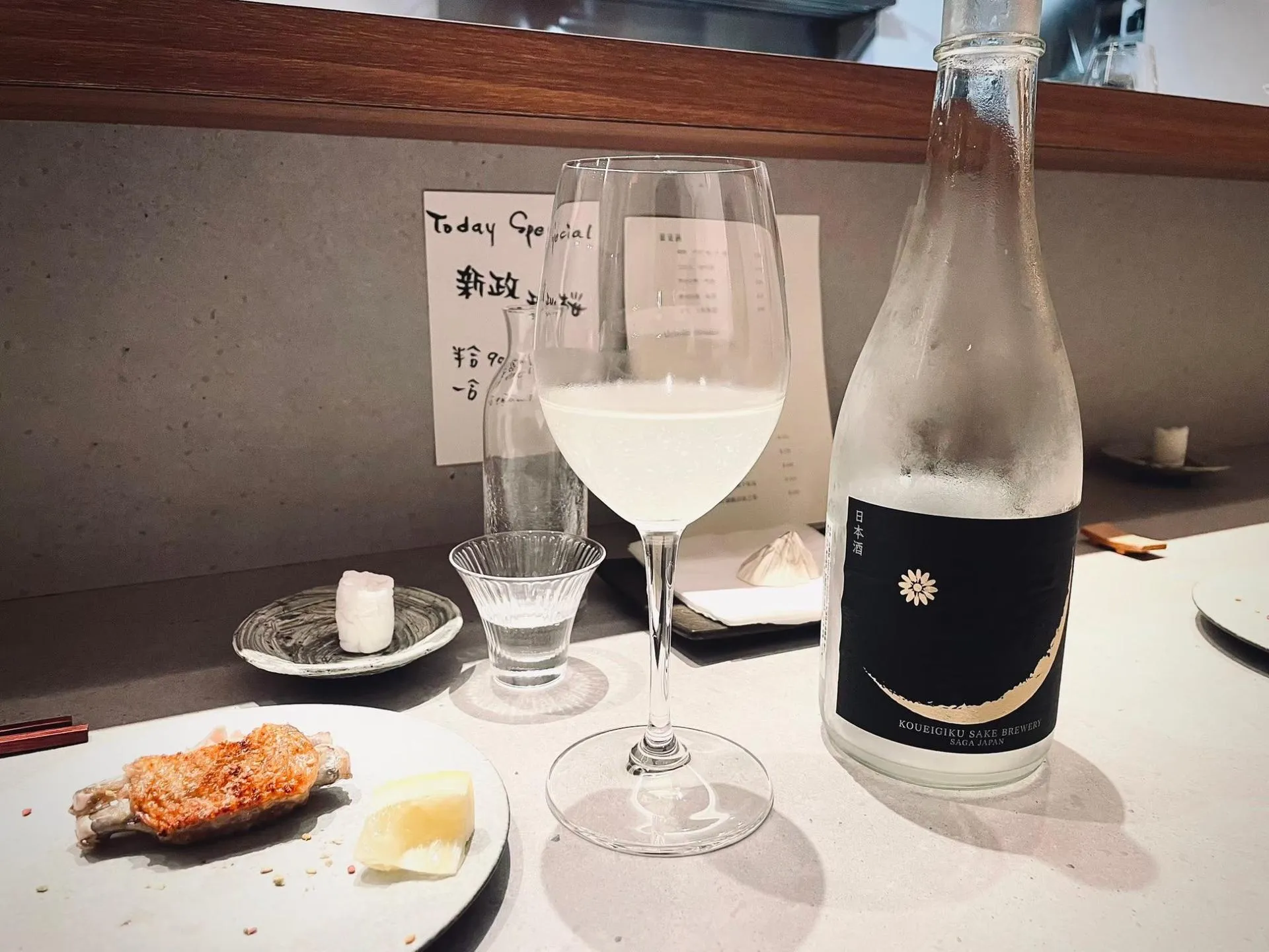 汲汲 Kyukyu 對餐酒搭配的重視體現在整體用餐過程的每一個環節。當我們剛入座時,服務員送上一杯清酒作為開場。這款清酒的選擇極具巧思——它輕盈卻帶有細膩的果香,溫和的米香在口腔中慢慢散開,為接下來的餐點準備了最恰當的基調。