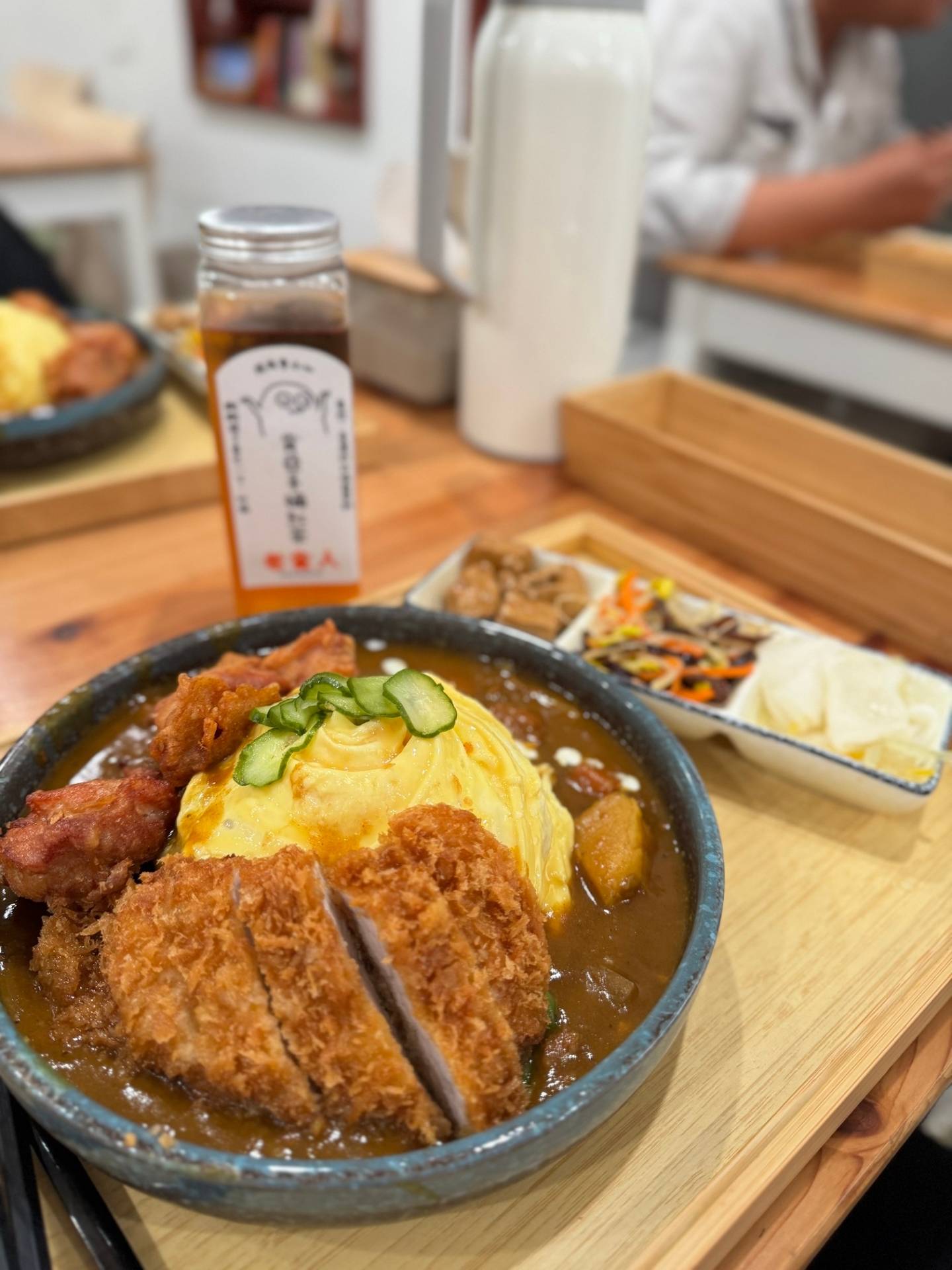 那天原本只打算隨便吃點東西填飽肚子,但朋友的話突然跳進我的腦海:「老食人的咖哩蛋包飯,絕對能讓你改變對咖哩飯的看法。」於是,我毫不猶豫地轉了方向,來到了這間隱藏在苗栗巷弄中的餐廳。老宅改建的門面低調中透著溫暖,招牌上寫著的「老食人」三個字好像在默默告訴我:「進來試試吧,這裡的味道會讓你記住很久。」