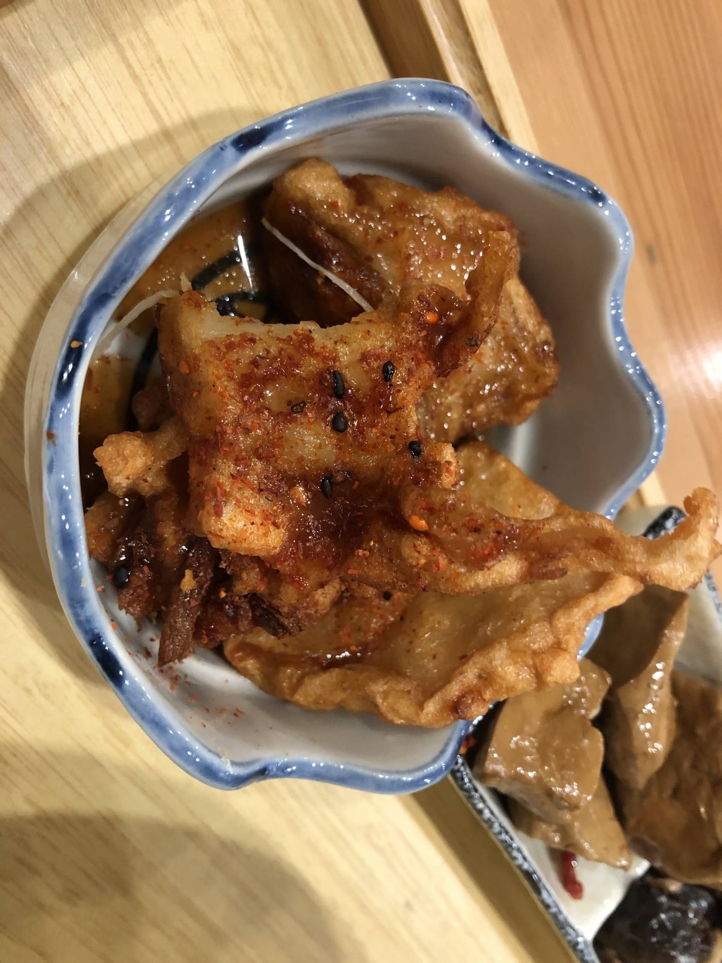 當我還沉浸在咖哩蛋包飯的餘韻時,「小島手工牛蒡甜不辣」悄然上桌。這道小菜看似簡單,但其實背後有一段故事。據說這是老闆學生時代從師父那裡學來的秘方,特別交由基隆的魚丸店製作,成為老食人菜單上的特色之一。