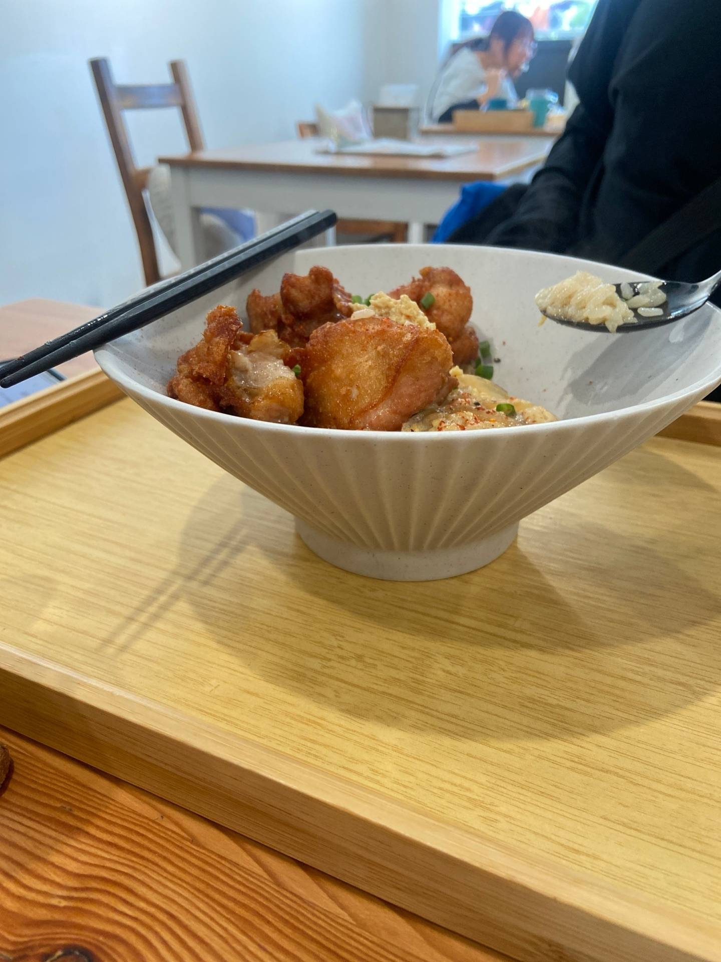 這還不夠,丼飯上淋著一點特製的日式醬汁,鹹甜適中,稍稍浸濕了飯粒,讓每一口都多了層次。泡菜則帶來了一絲酸爽,正好中和了唐揚雞的油膩感。吃到一半,我忍不住想,如果生活中的每頓飯都能像這樣簡單又幸福,那該多好啊。