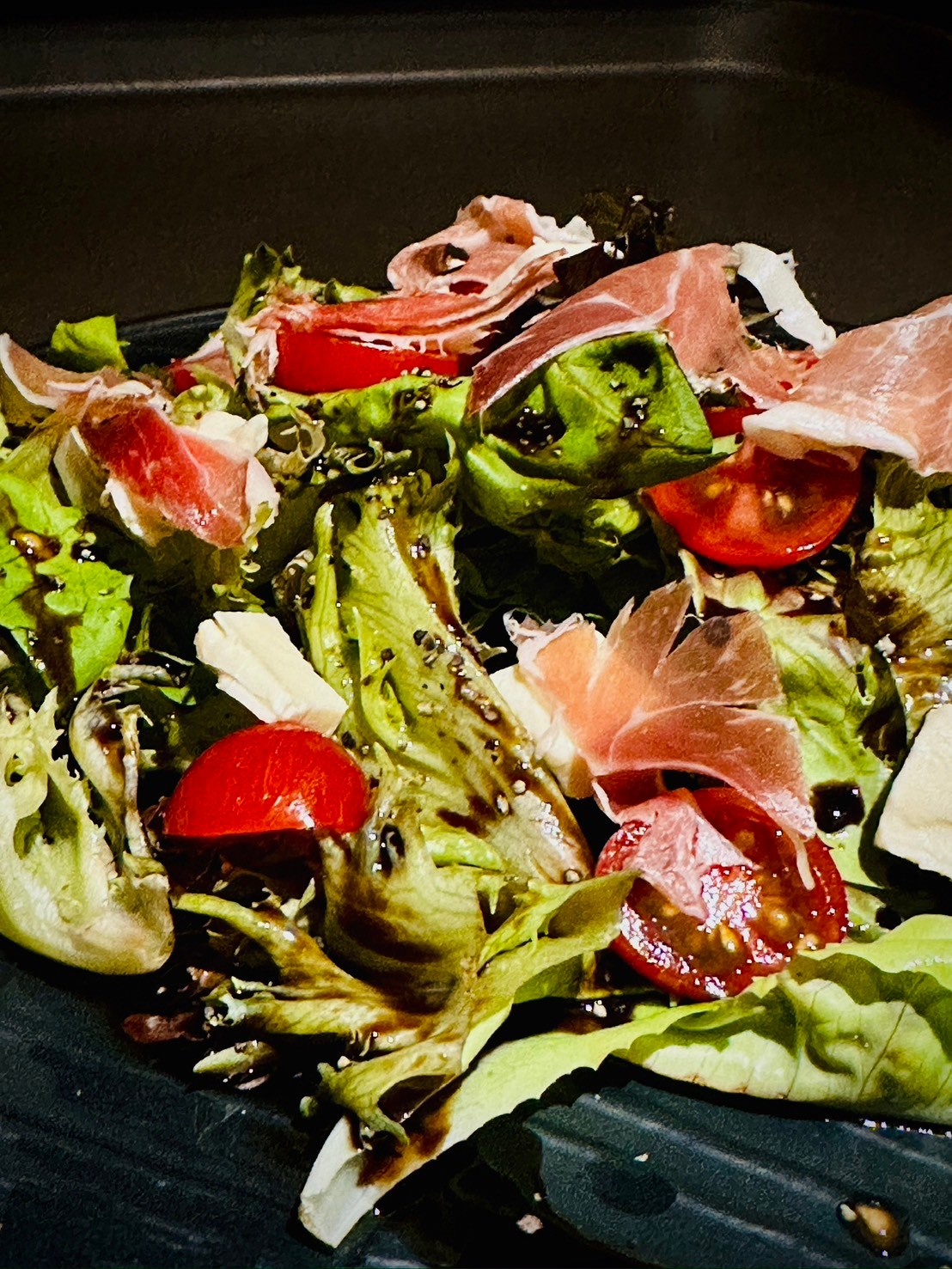 接著是我們的另一道必點菜——賽諾羅生火腿沙拉。這道沙拉的火腿片超級薄,吃起來很有層次感,配上新鮮的綠葉蔬菜,每一口都帶有清新的感覺。而且他們使用的火腿味道非常濃郁,完全不會輸給市面上的其他火腿。這道菜吃得讓人滿足,無論是配酒還是配調酒,都是完美的開胃小品。
