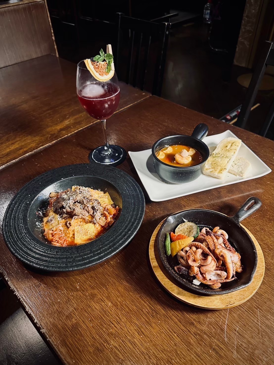 除了調酒,餐點也是這裡的亮點。當天我們品嘗了他們的沙嗲牛肉串,外脆內嫩,搭配沙嗲醬的香濃味道,一口接一口根本停不下來。還有他們的酥炸魷魚,每一口都香脆可口,完全不油膩,真的是下酒的好夥伴。這些小吃與調酒搭配得天衣無縫,讓整個用餐體驗更加豐富。