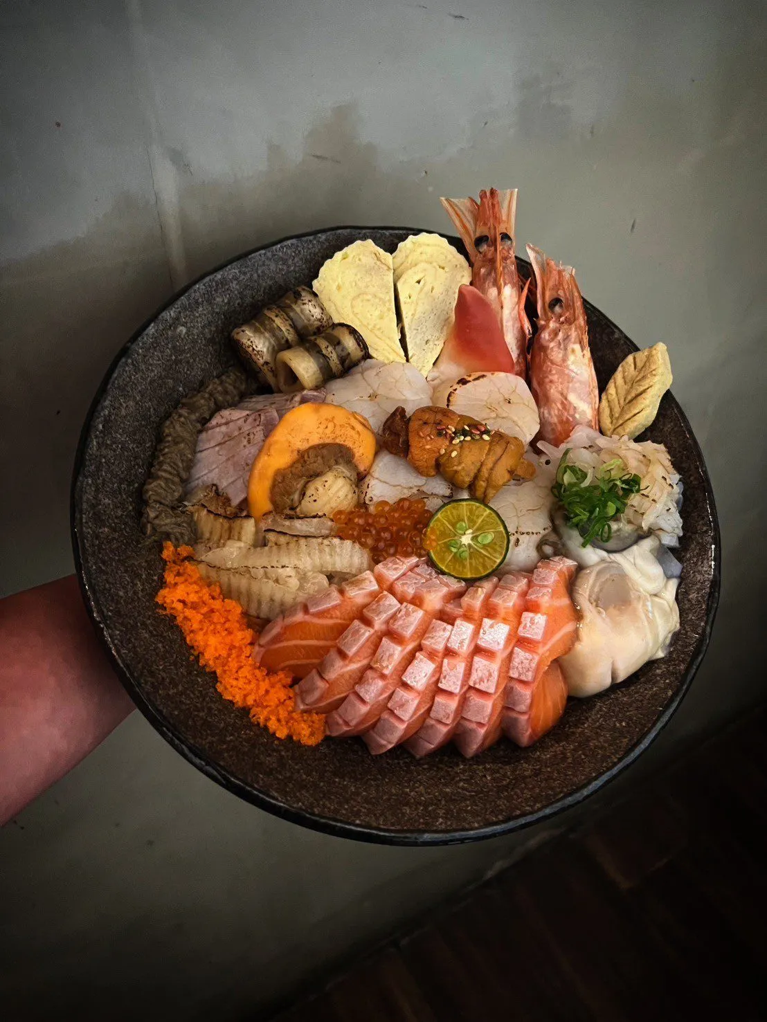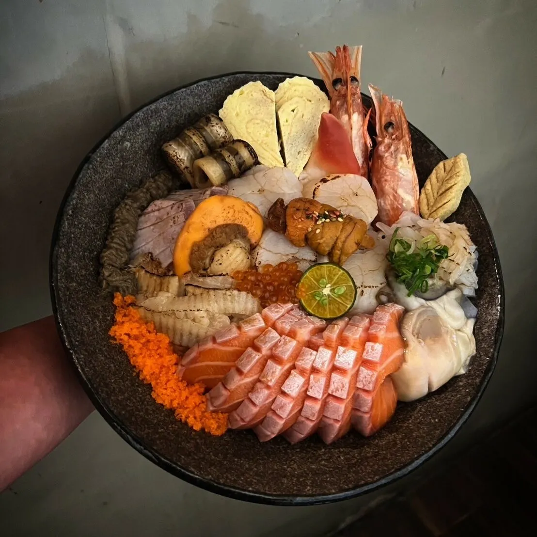 丼飯上桌的那一刻,我真的被它的賣相驚艷到了。碗裡滿滿的有鮭魚、旗魚、鮪魚等十種不同的海鮮,顏色鮮豔,看起來就讓人垂涎欲滴。玉子燒的愛心擺飾更是點睛之筆,讓整道料理充滿了愛。