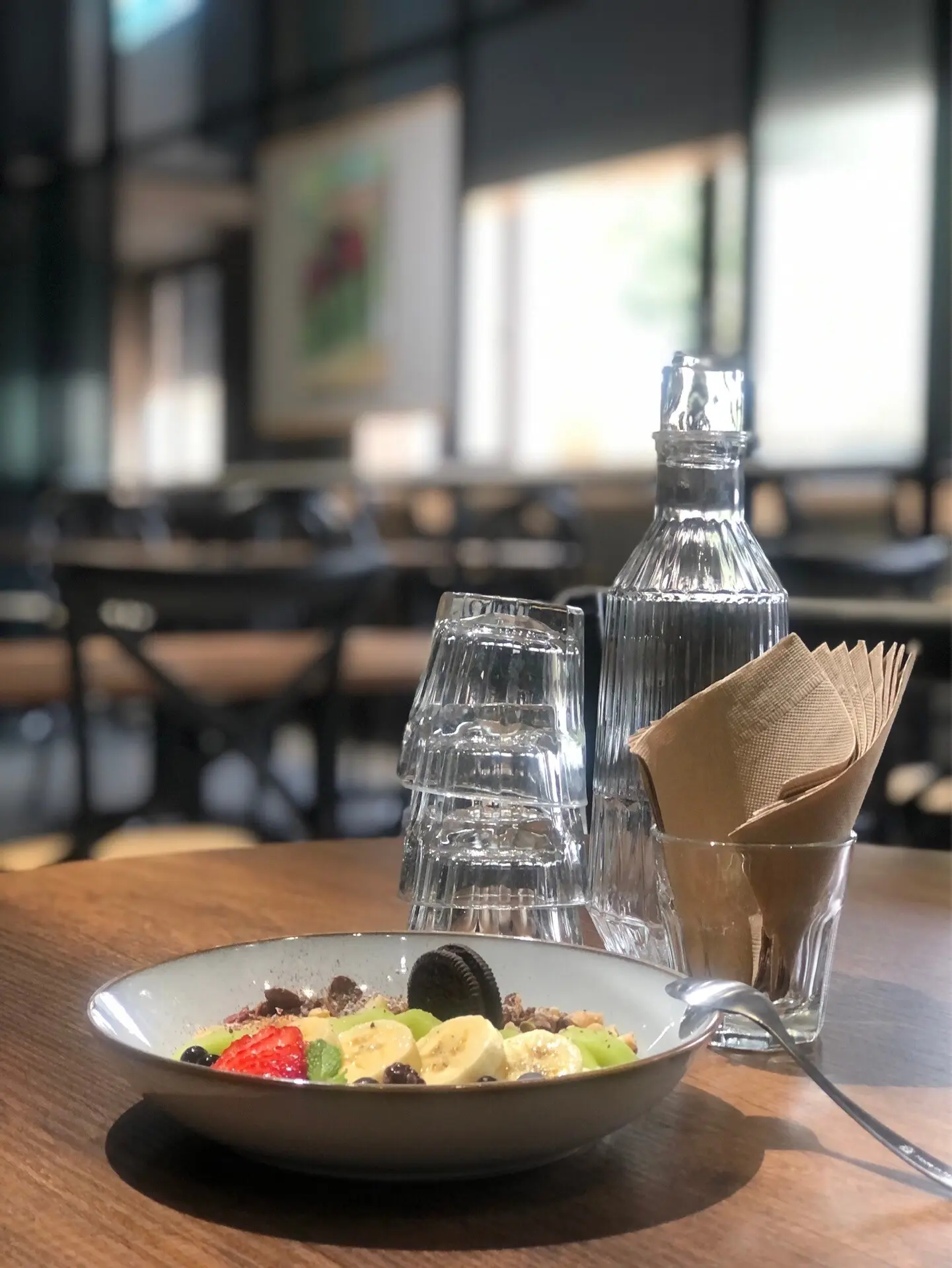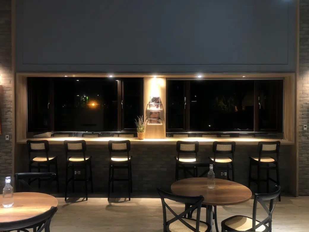 當我一踏進餐廳時,立刻被這裡的氛圍吸引住了。店內裝潢是黑灰色牆面搭配著木質家具,低調中帶著質感,讓人感覺既現代又舒適。最棒的是,窗邊的座位剛好可以看到外面的行道樹,感覺好像找到了城市裡的一片靜謐小天地。