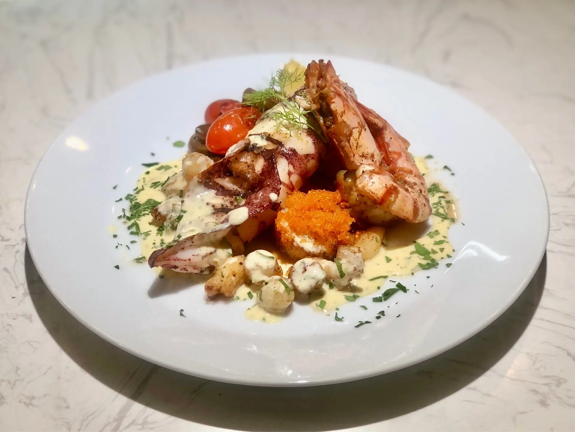 首先上桌的是蒜香鮮蝦意大利麵。一上來,我就被那幾隻飽滿的蝦子吸引住了。麵條Q彈有光澤,蝦肉鮮嫩欲滴,還散發著濃郁的蒜香味。我迫不及待地夾起一口麵條送入口中,蒜香味瞬間在嘴裡蔓延,蝦肉彈牙又鮮美,海鮮的清甜與蒜香融合得剛剛好。每一口都讓我感覺自己彷彿置身於海邊的餐桌上,充滿了清爽的感覺,這道菜真的是一個完美的開始。