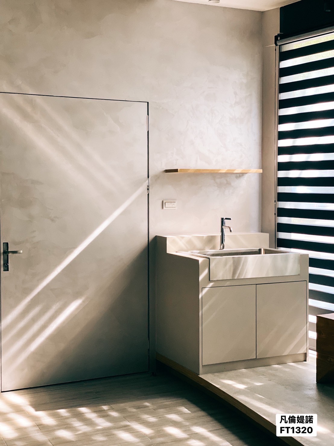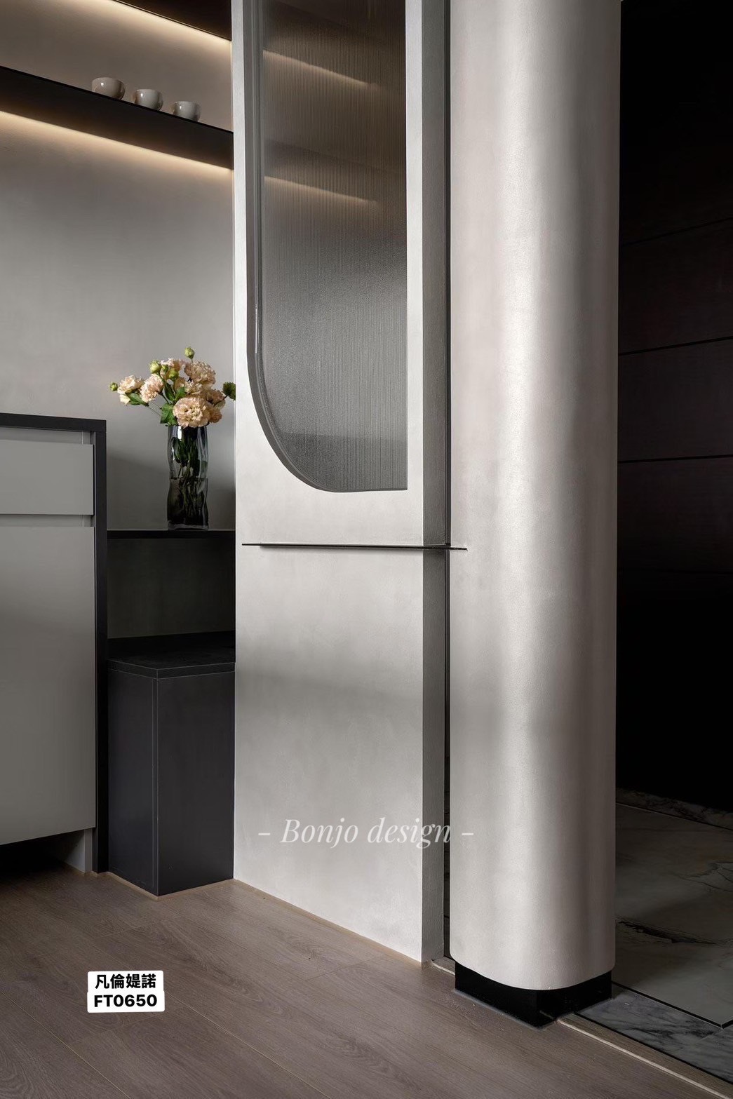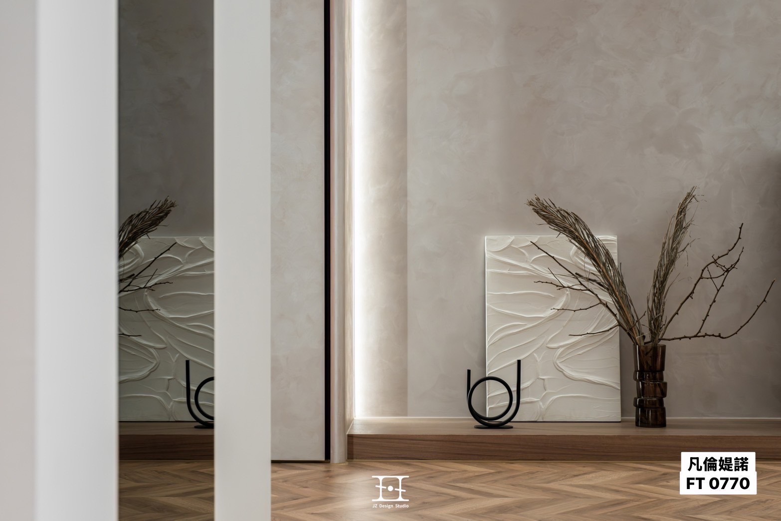 真正吸引我的是凡倫提諾金屬灰泥帶來的「觸感體驗」。它不像傳統金屬漆給人冰冷的印象,而是有著天鵝絨般的絲滑感。當手輕觸牆面時,能感受到一種細膩的柔和,低調中帶著奢華,既現代又溫暖。再加上天然珠光的效果,讓牆面在不同角度下呈現細緻的光澤變化,無論是客廳的主牆還是走廊的過渡區,都能散發獨特的藝術氣息。