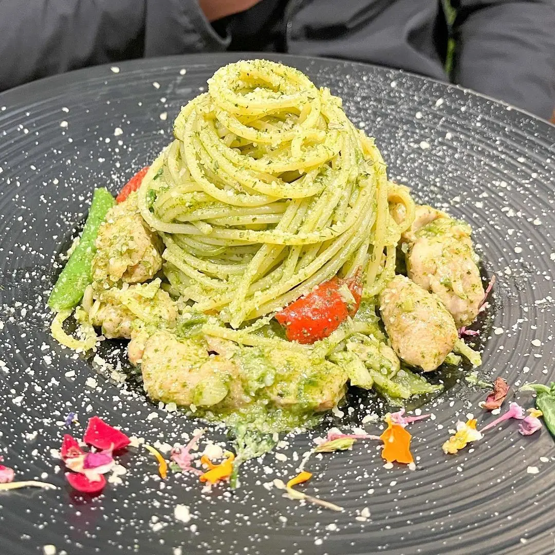 接下來上桌的是青醬雞肉義大利麵。這道義大利麵帶有濃郁的青醬香氣,特別之處在於它的收汁方式,每根麵條都緊緊吸附著青醬,散發出香草與橄欖油的迷人芳香。主廚選用了紐奧良風味的雞腿肉,外層酥脆而內部柔嫩多汁,與義大利麵完美融合。每一口都充滿了對味蕾的呵護,青醬的濃郁和雞肉的柔嫩相互襯托,讓這道義大利麵在簡單之中展現出無與倫比的美味。