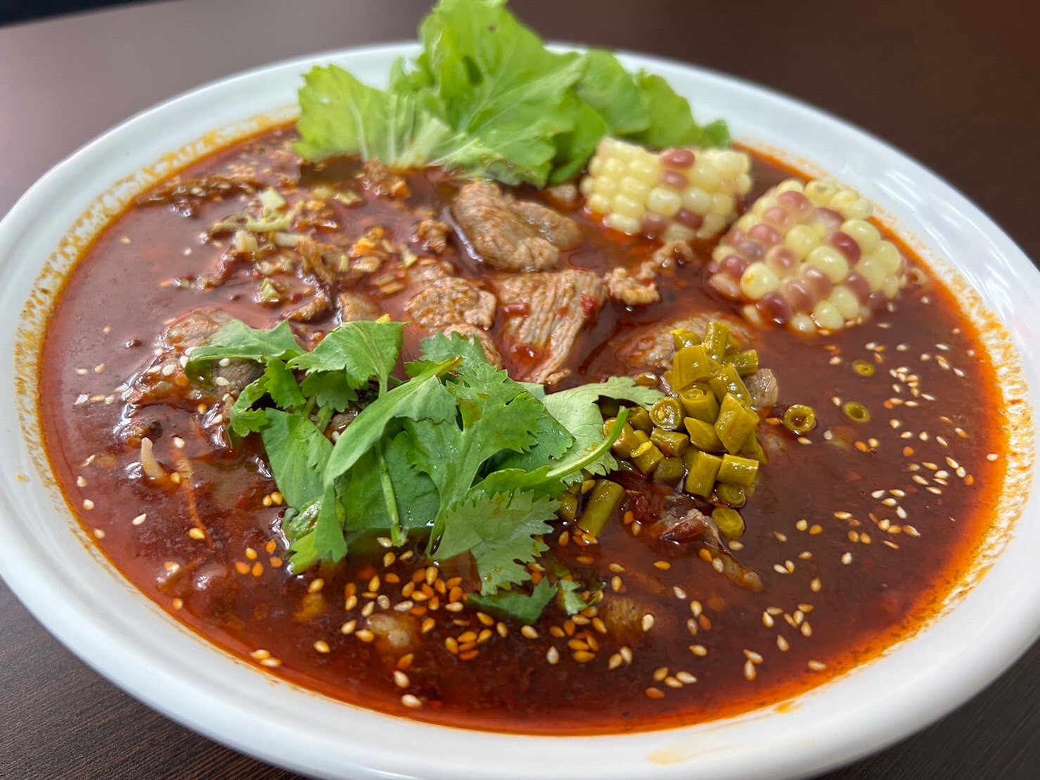 再來說說水煮牛。紅通通的湯底上浮著花椒與辣油,第一口喝下會驚訝於那股香氣,不是一般重辣重鹹的做法,而是溫潤中帶點後勁的香麻味。肉片比預期的多很多,鴨血跟豆腐也超入味,我跟朋友兩個人邊吃邊讚嘆,嘴巴停不下來。