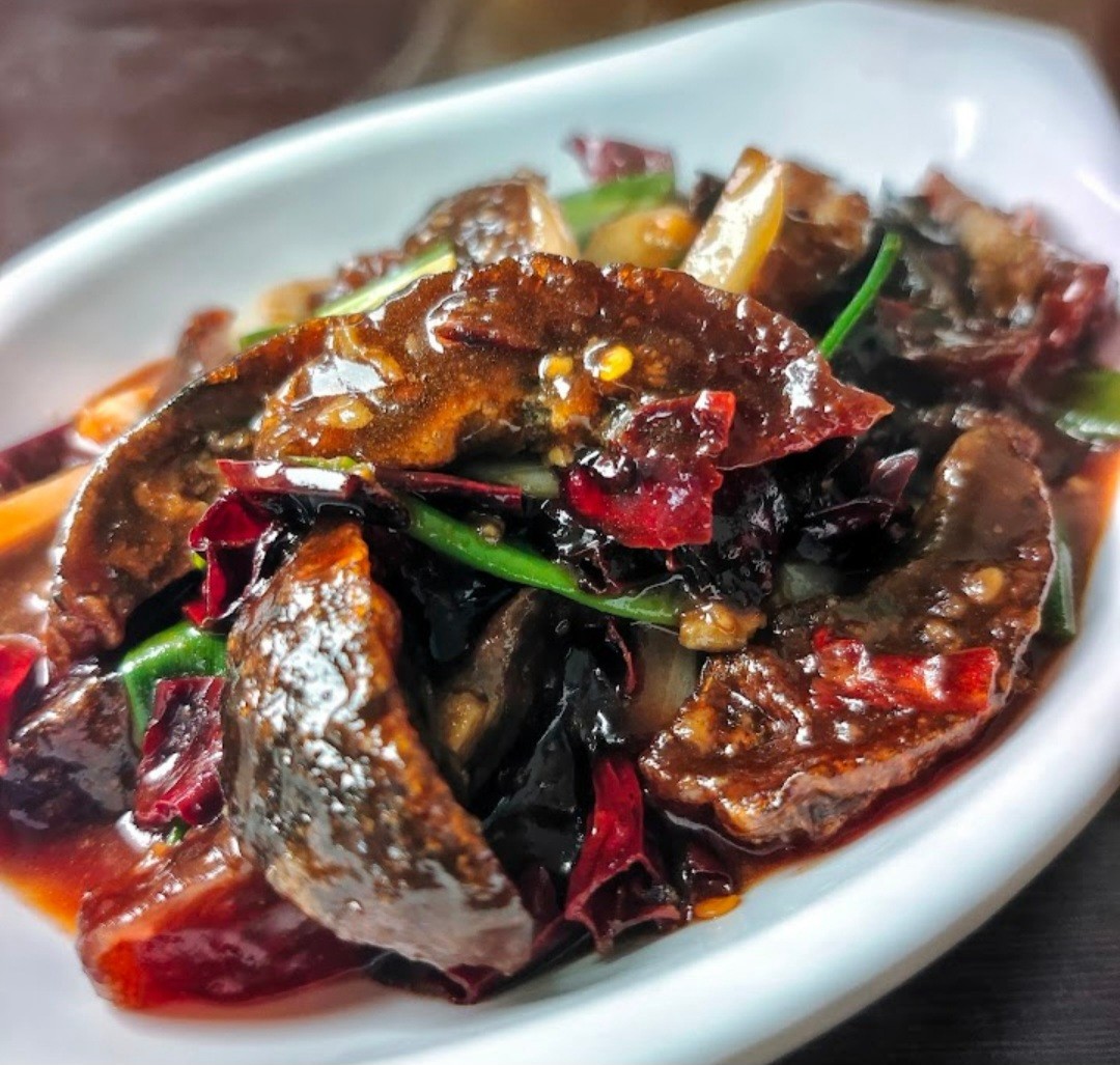 先上桌的是主角「川味水煮牛」,紅湯鋪滿花椒與辣油,香氣直接撲鼻。剛端上來還冒煙,舀了一塊牛肉放嘴裡,肉滑又帶點彈性,咬開之後那股麻香跟辣勁同步爆發,像是有人輕輕打開了你的神經開關,一整個醒神!