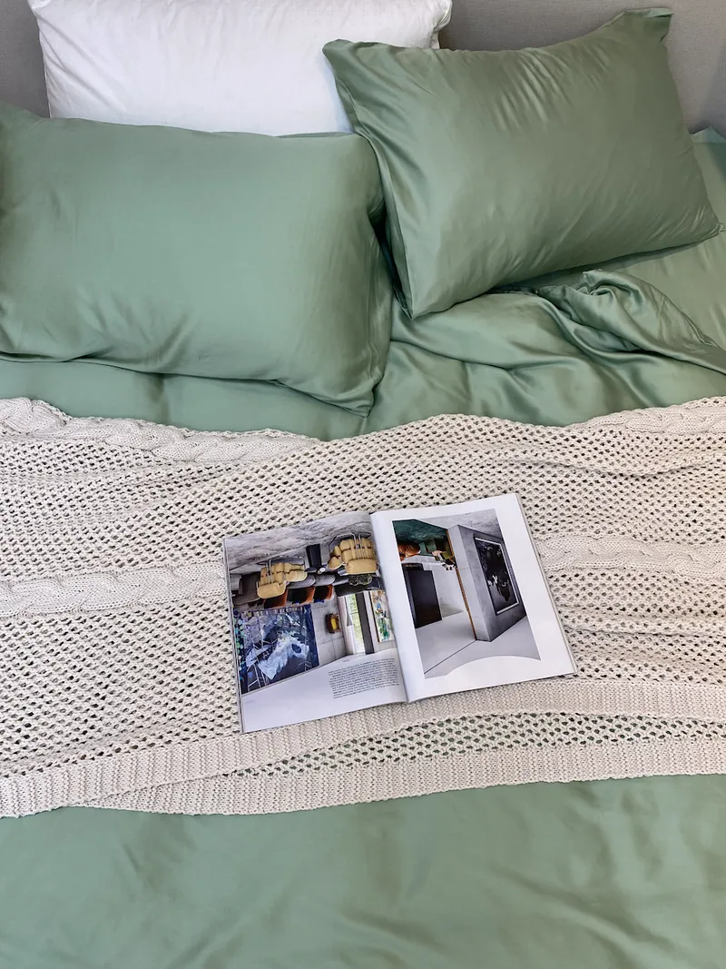挑選的是一組天絲與棉混紡的灰綠床包組,從網站下單到收到商品,不到五天,速度效率令人驚喜。但真正令人驚艷的是內容物本身。打開布製束口袋的瞬間,一股輕柔天然的氣息撲鼻而來,床包的手感像是剛洗好曬乾的陽光味棉被,柔軟中帶點細緻滑順的質地。