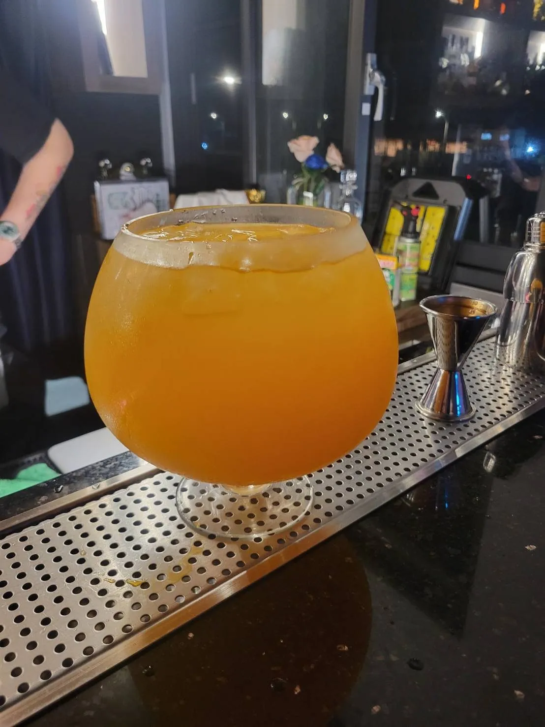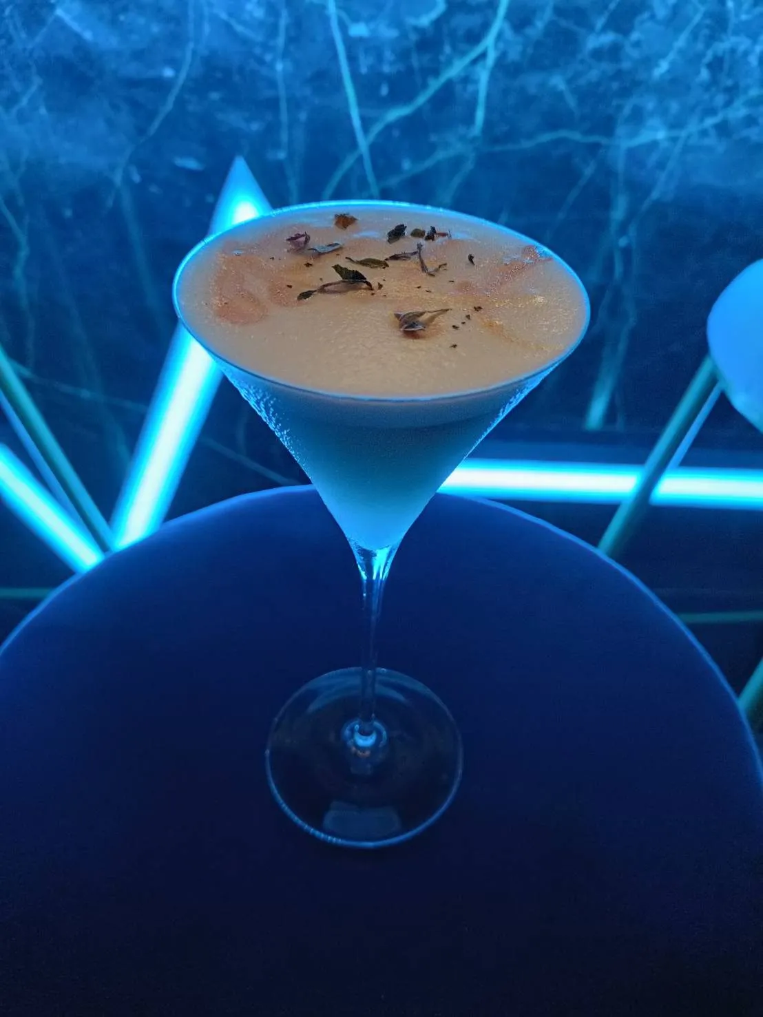 我首先被吸引的是他們的「太空漫步」調酒。這款調酒的特殊造型和夢幻乾冰效果讓人一見傾心。當調酒師將乾冰放入酒中,霧氣緩緩上升,宛如置身於太空。這款調酒使用梅酒作為基底,香氣四溢,搭配著浪漫的氛圍,簡直就是約會的最佳選擇。