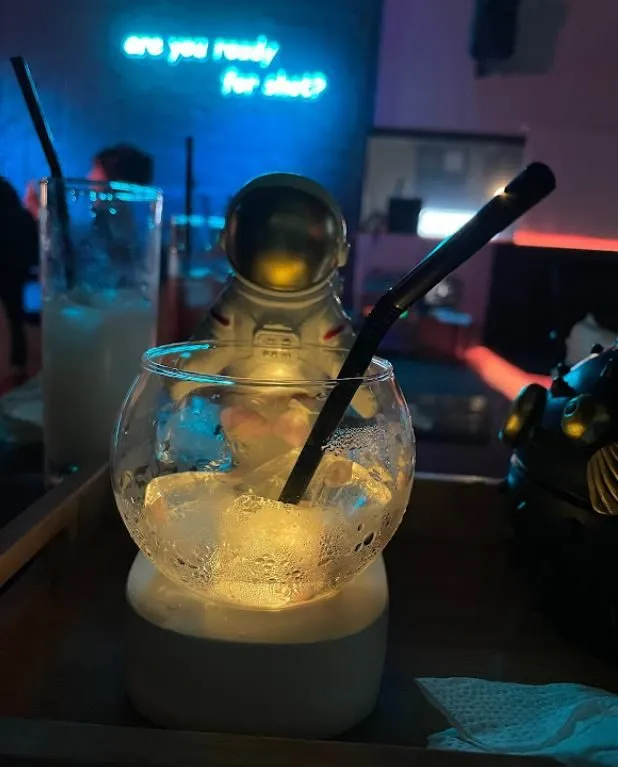 接著,我們又點了一杯太空漫步。這杯酒的外觀就像它的名字一樣夢幻,使用梅酒為基底,再搭配乾冰效果,讓整個酒杯看起來如同漂浮在太空中。當乾冰煙霧緩緩升起,整個桌面都被渲染成了夢幻的場景。這杯酒的口感清爽,帶有微微的梅子香氣,非常適合在這樣的氛圍中享用。