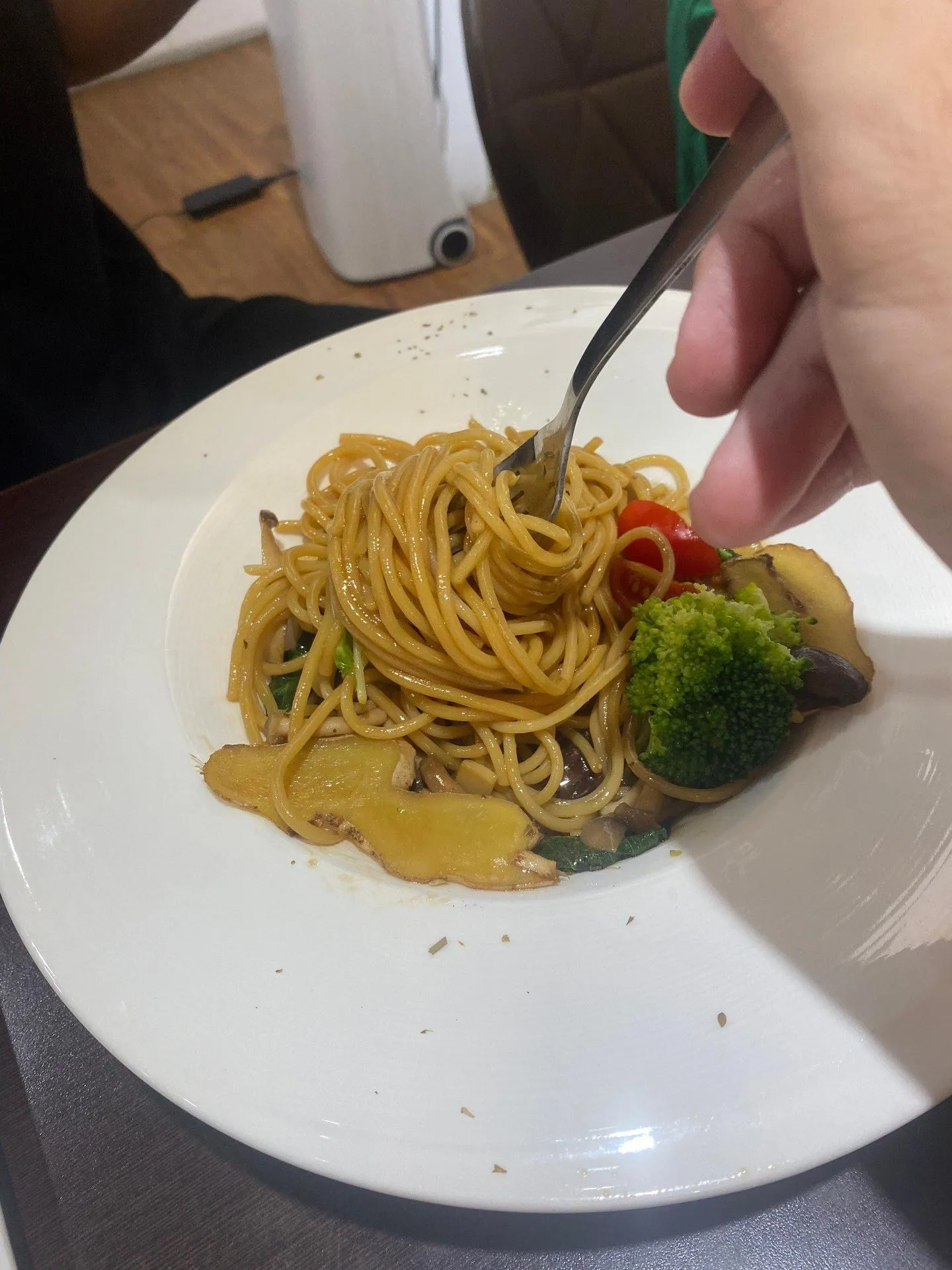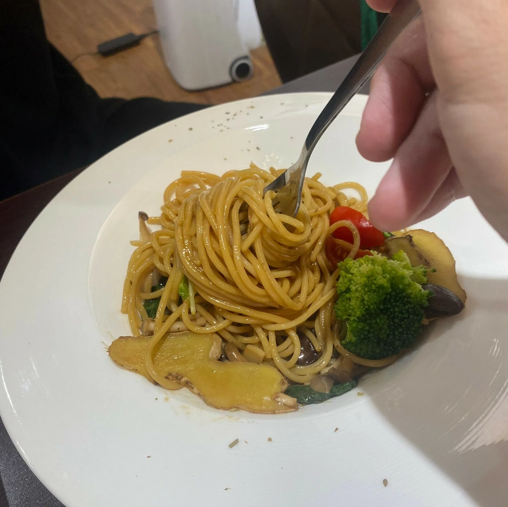 除了雞肉丼,我還嘗試了他們的「三杯義大利麵」。這道菜將台灣傳統的三杯料理與義大利麵結合,創造出獨特的風味。濃郁的醬汁滲透在每一根麵條中,每一口都是美味的享受。