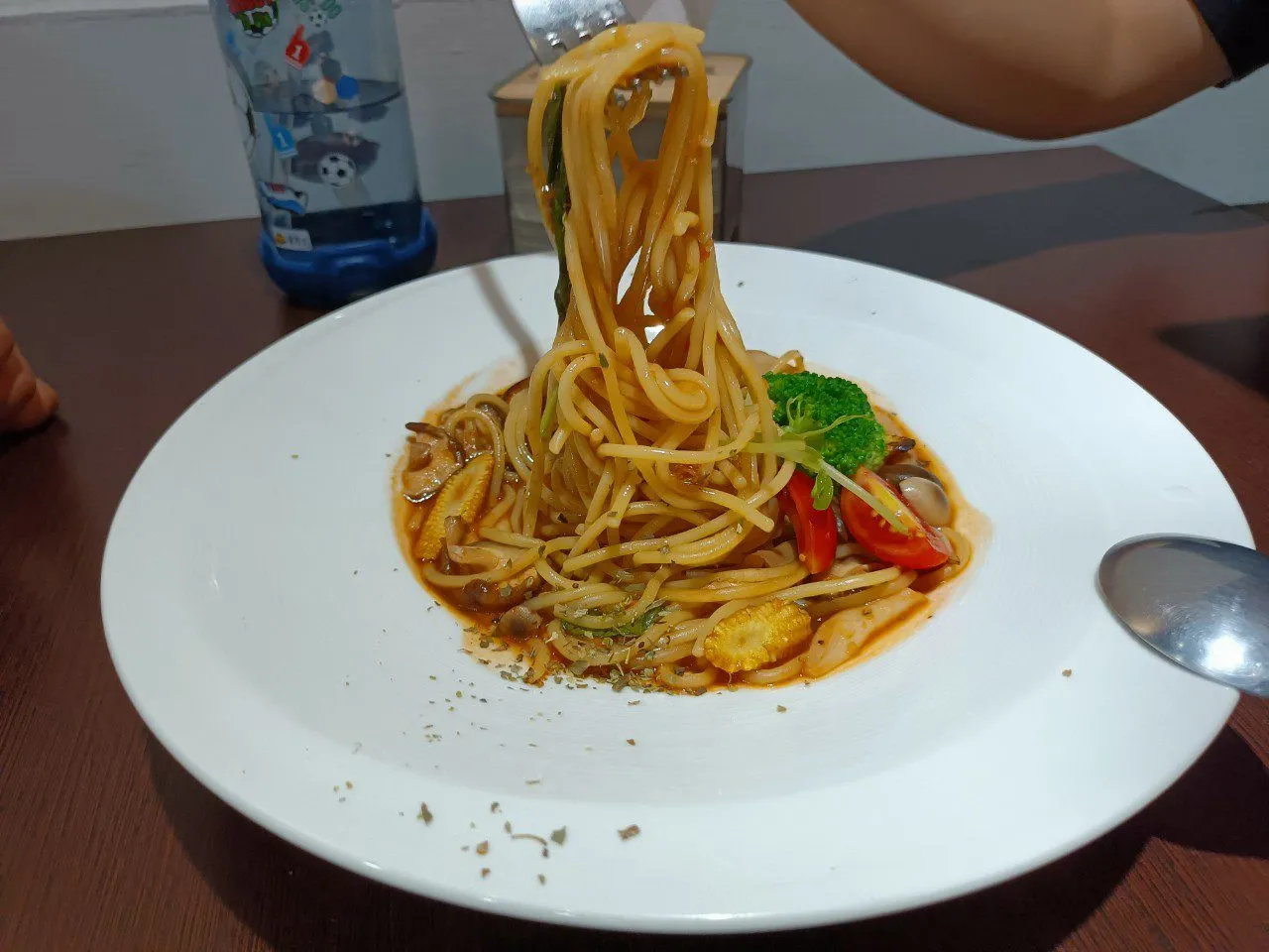 接下來的紅醬野菇義大利麵更是讓我愛不釋口。濃郁的紅醬包裹著每一根麵條,野菇的鮮美和義大利麵的Q彈完美結合,口感層次豐富。