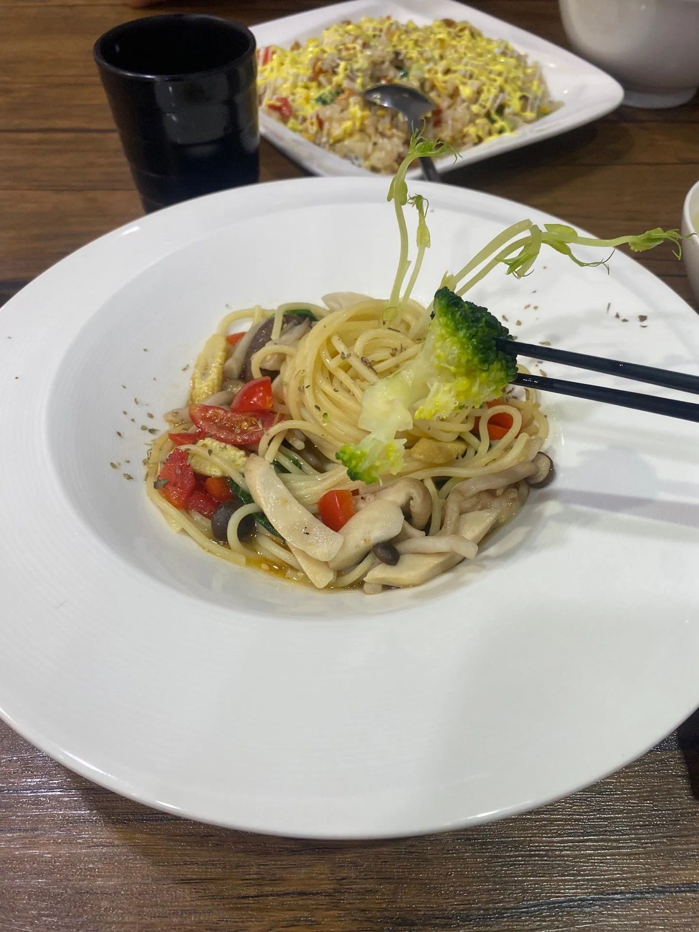 香酥豆包丼的豆包外皮酥脆,搭配上特製的醬汁,味道絕妙。清炒塔香義大利麵則是用新鮮的九層塔和蔬菜配上獨特醬料,口感豐富且充滿香氣。炸水餃外皮金黃酥脆,內餡飽滿,令人回味無窮。