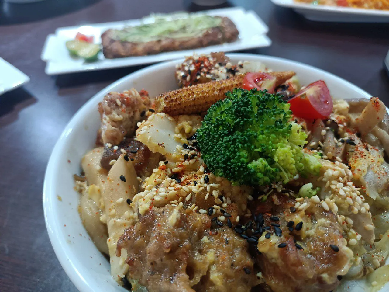 我們點了幾道招牌菜,其中最讓我驚豔的是雞肉丼和炸水餃。這兩道菜不僅外觀上與葷食無異,口感上更是讓人無法分辨。特別是雞肉丼,仿葷的雞肉質地細膩,搭配香濃的醬汁,讓人一口接一口停不下來。