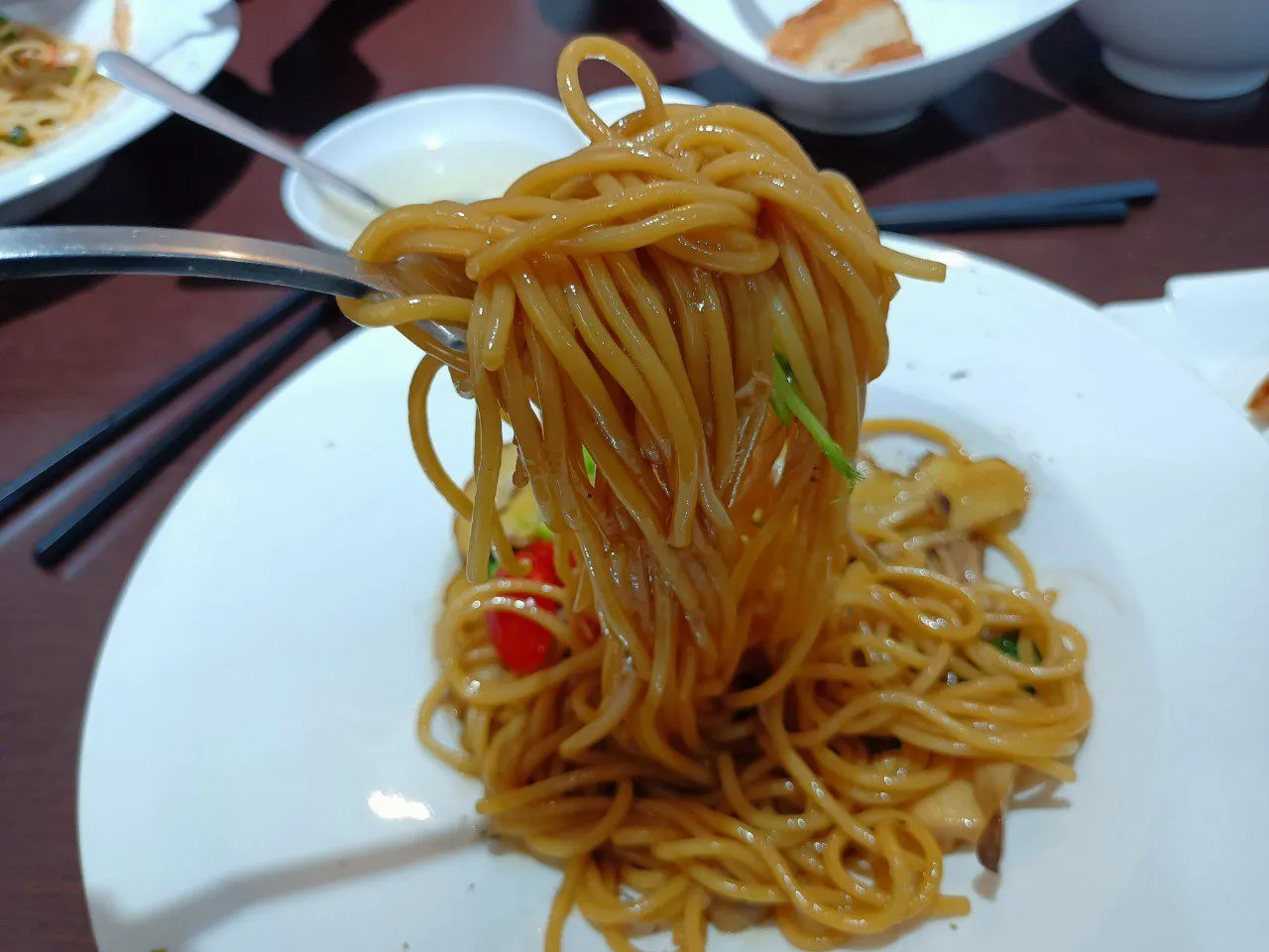 除了雞肉丼,我們還嘗試了台式三杯義大利麵和蔬食鱈魚排。三杯義大利麵將台灣經典的三杯雞風味融入到義大利麵中,既有傳統的香氣,又有異國的風情。而蔬食鱈魚排則是另一個驚喜,外酥內嫩,完全不輸給真正的鱈魚排。