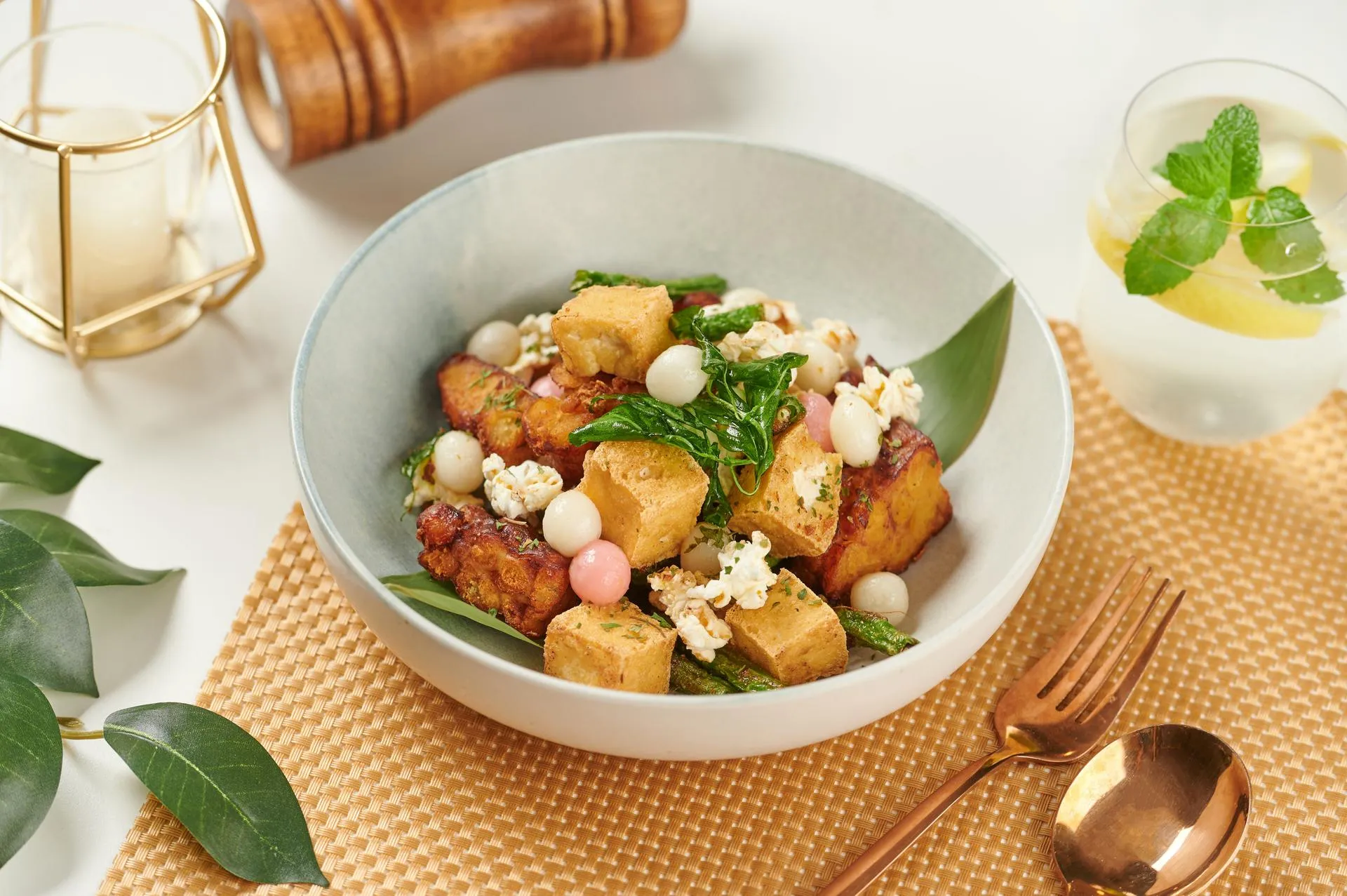 這次我點了「鹹酥G椒鹽手作天貝」和「泰式綠咖哩百香燉」,老實說,這些菜光是名字就讓我很好奇。當天貝端上來時,那香氣立刻撲鼻而來,我忍不住馬上咬了一口,結果驚為天人!天貝的脆口感搭配濃郁的椒鹽味,完全顛覆了我對素食的印象。綠咖哩則是另一個驚喜,椰奶的香甜搭配百香果的酸甜,讓這道料理變得非常豐富且有層次感。