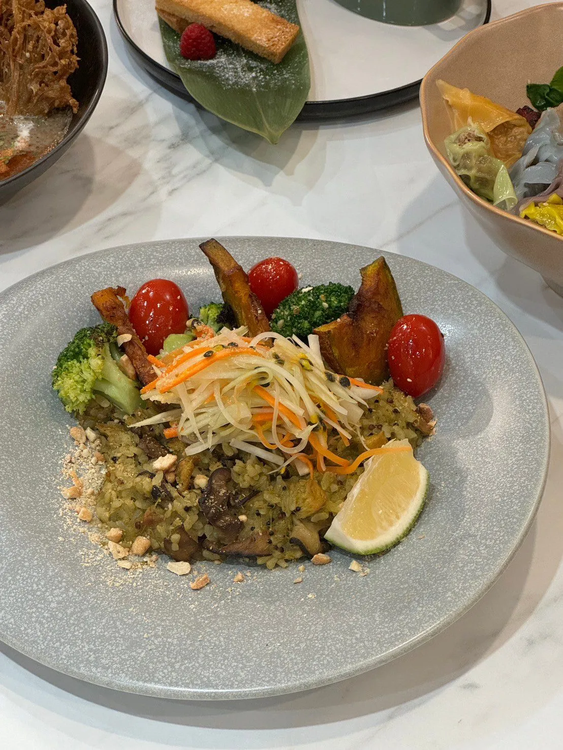 這次我點了「鹹酥G椒鹽手作天貝」和「泰式綠咖哩百香燉」,老實說,這些菜光是名字就讓我很好奇。當天貝端上來時,那香氣立刻撲鼻而來,我忍不住馬上咬了一口,結果驚為天人!天貝的脆口感搭配濃郁的椒鹽味,完全顛覆了我對素食的印象。綠咖哩則是另一個驚喜,椰奶的香甜搭配百香果的酸甜,讓這道料理變得非常豐富且有層次感。