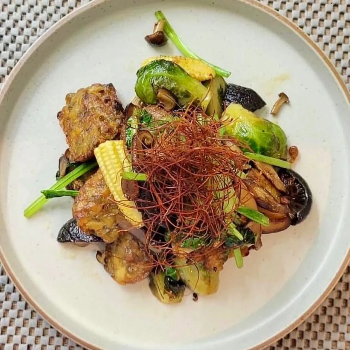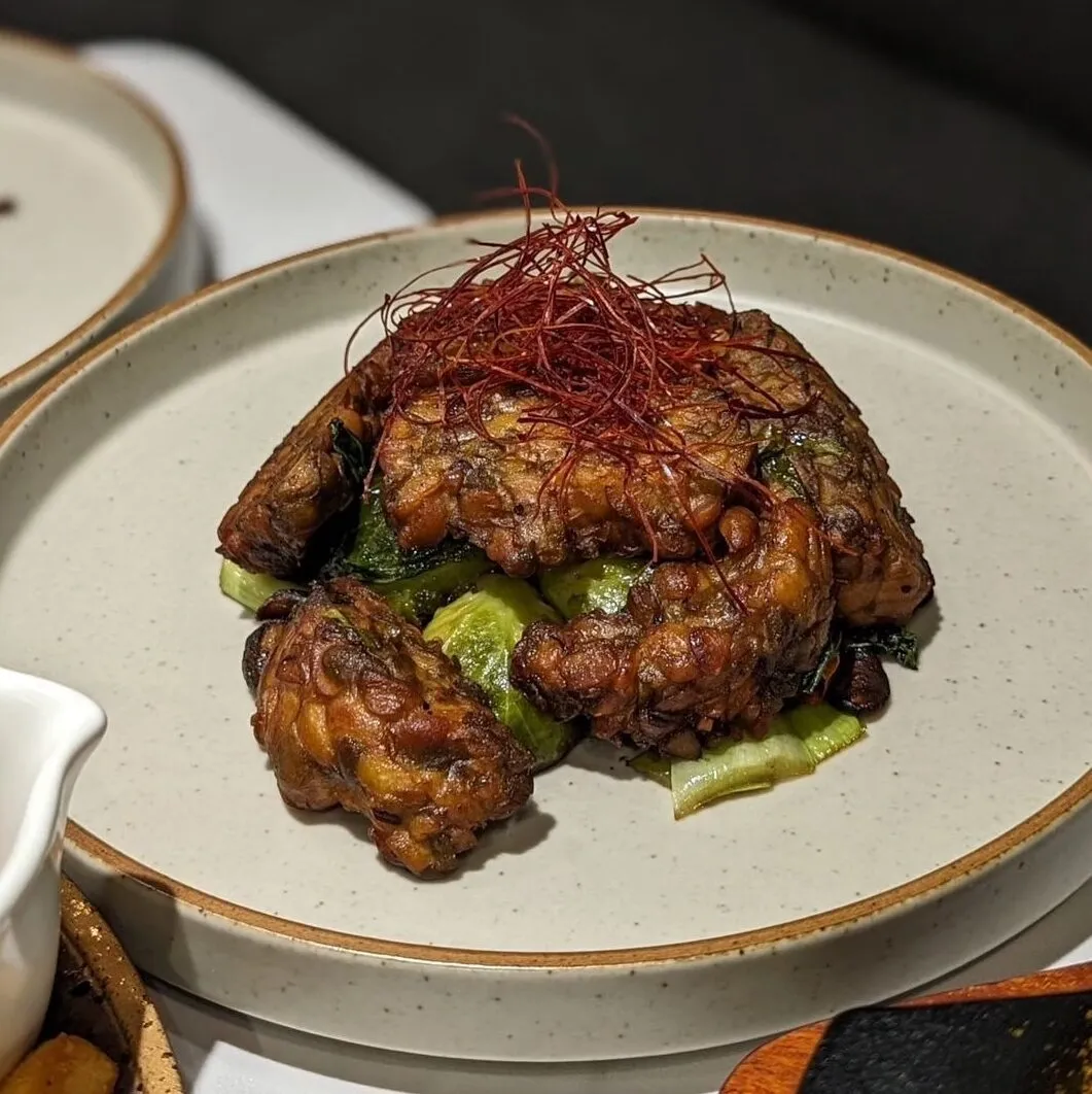 這裡的服務生特別親切,並微笑著為我介紹了星嫵蔬食的招牌菜——雲朵天貝。這道食材經過五年的研發,創辦人以精湛的技術和無限的創意,將天貝這種素食界的超級食物帶到了新的高度。當泰式天貝端上桌時,泰式酸辣醬與百香果結合,散發辣椒的辛香與清爽的果香,輕輕切下一塊送入口中,天貝的口感柔軟卻帶有嚼勁,每一口都充滿驚喜。