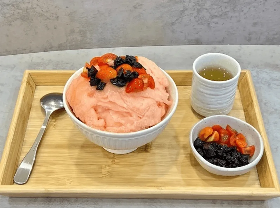 接著是酸梅雪花冰。這款雪花冰的酸梅味道非常濃郁,入口即化,清涼中帶著淡淡的酸甜,非常適合夏天解暑。每一口都讓我感受到這款雪花冰的用心製作,完全沒有人工的甜味,吃起來非常自然。