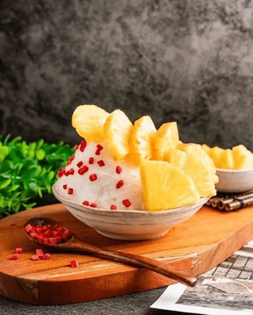 這裡的雪花冰每一款都是由自製冰磚製成,完全無添加任何人工香精和防腐劑,是純天然的健康選擇。我點了綜合岩藏和梅荔鳳梨,兩款截然不同的口味。