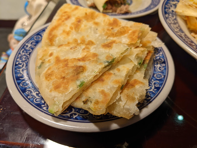 蔥油餅這東西,幾乎每家北方館子都有,可是要做到「一口下去能讓人心服口服」的卻很少。第一次在兩支吃到它,是個下雨天。外頭濕冷,鞋子都被雨水浸得有點沉。餅端上來的時候,外皮金黃,邊緣微微翹起,熱氣帶著蔥香撲面而來。我咬下第一口,外皮清脆卻不碎裂,裡頭柔韌有嚼勁,蔥香一層一層地滲出來,混著麵粉的香氣,整個人瞬間暖了起來。